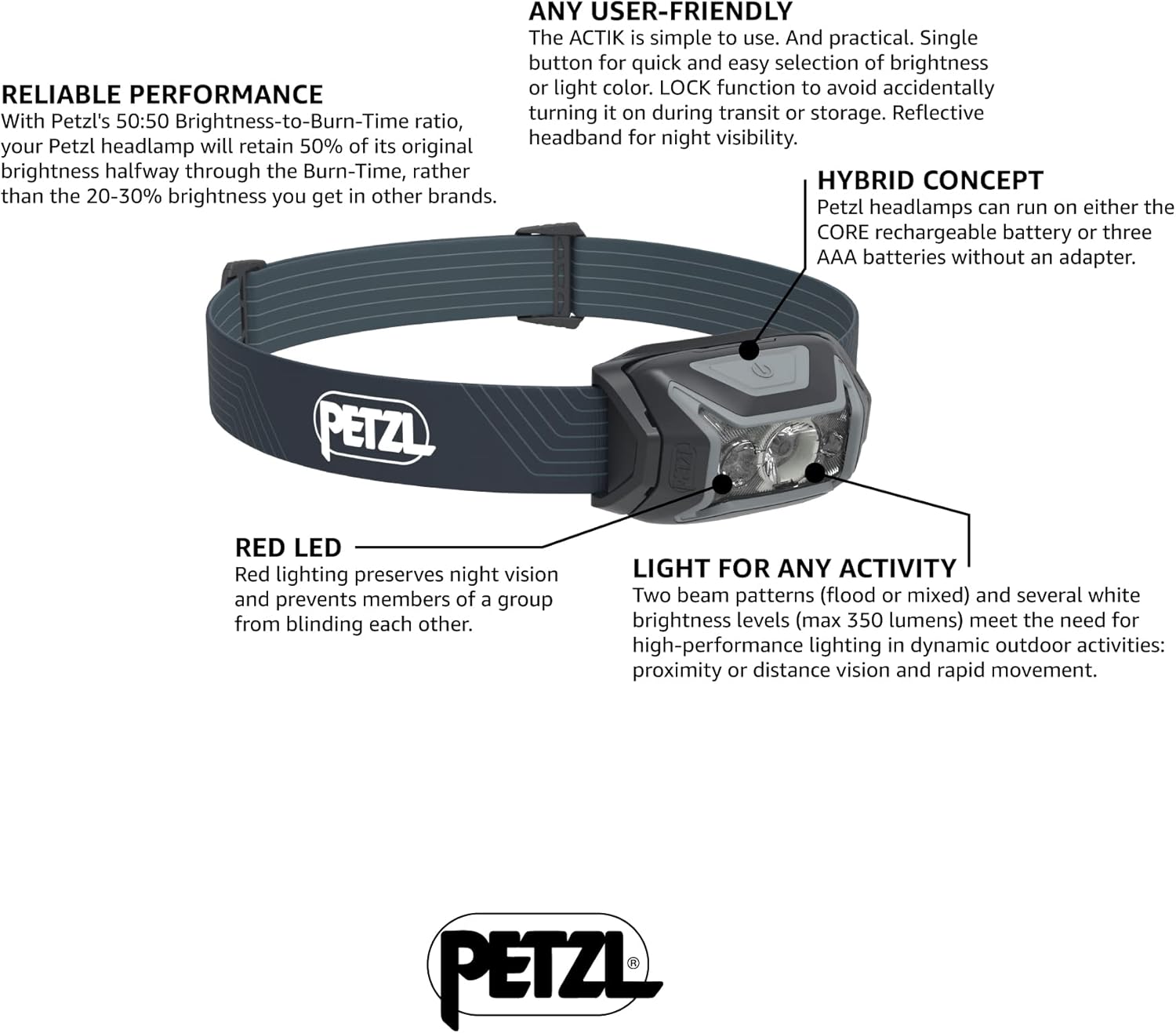 The ideal headlamp to extend your dynamic outdoor activities. Casting 450 lumens, ACTIK provides powerful and comfortable lighting to go with you when you’re running, trekking, or mountaineering. Its phosphorescent reflector makes it easy to find in the dark and red lighting keeps you from blinding those around you when you’re with a group. ACTIK comes with three standard AAA batteries and is also compatible with the CORE rechargeable battery, with its HYBRID CONCEPT design.