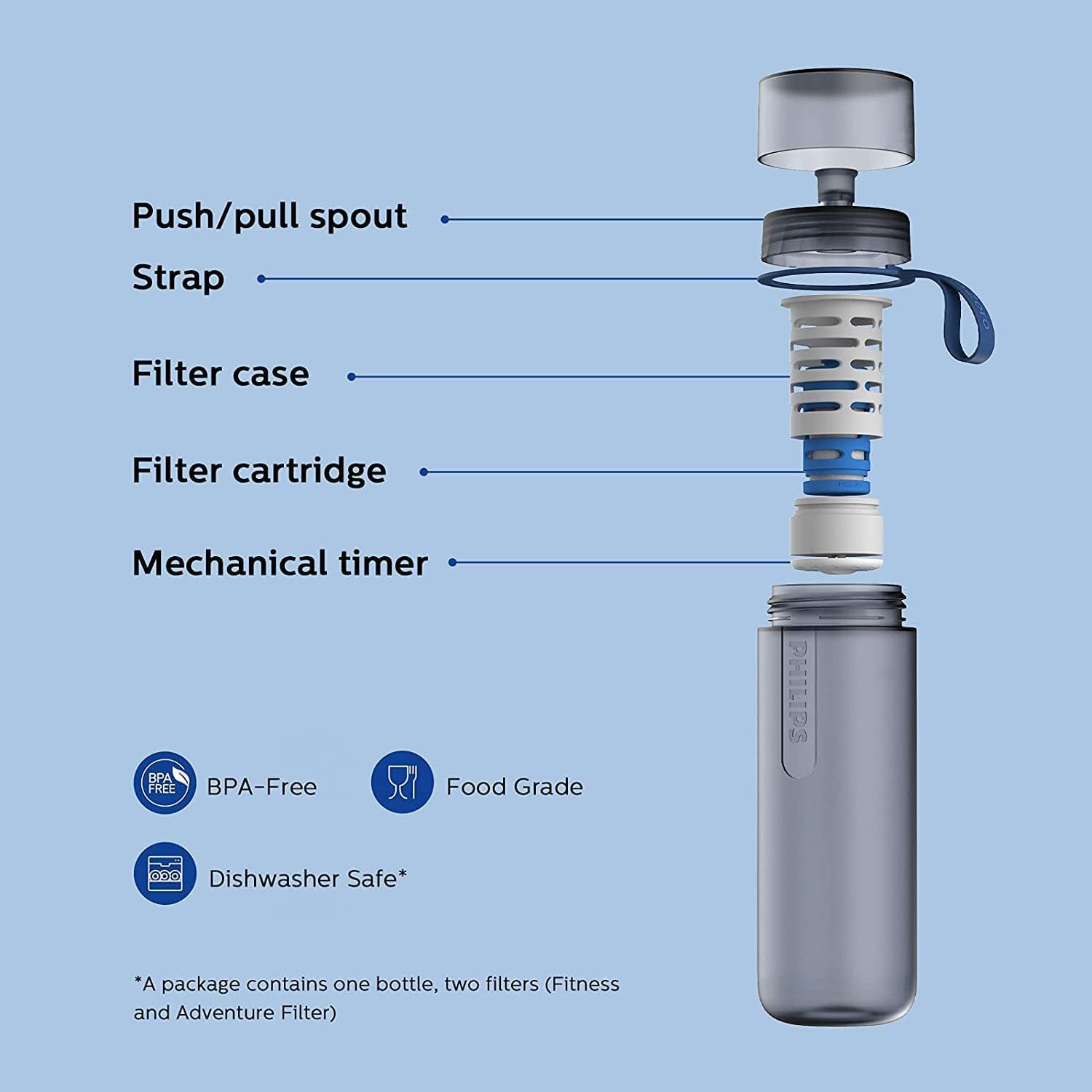 ๐ ๐๐จ๐ฆ๐ฉ๐ฅ๐๐ญ๐ ๐๐๐ญ๐๐ซ ๐๐จ๐ฅ๐ฎ๐ญ๐ข๐จ๐ง: This squeezable water filter bottle is designed to work with two interchangeable filters -โ the Fitness Filter: removes impurities from tap water(included), โก the Adventure Filter: eliminates contaminants from freshwater sources. such as river lake or spring water (included).