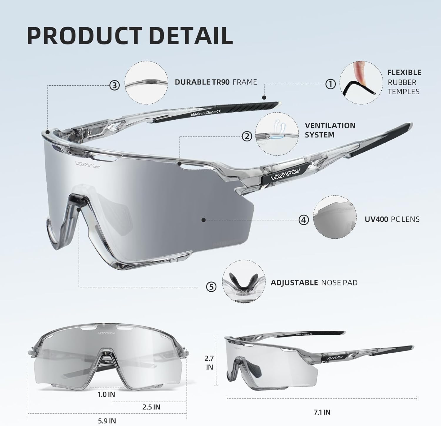 【TR90 Frame Sports Sunglasses】Designed for performance, ultra light TR90 frame offers durability, flexibility and all-day comfort. Weighing just 30g, it feels virtually weightless and reduces pressure on your face during long rides.