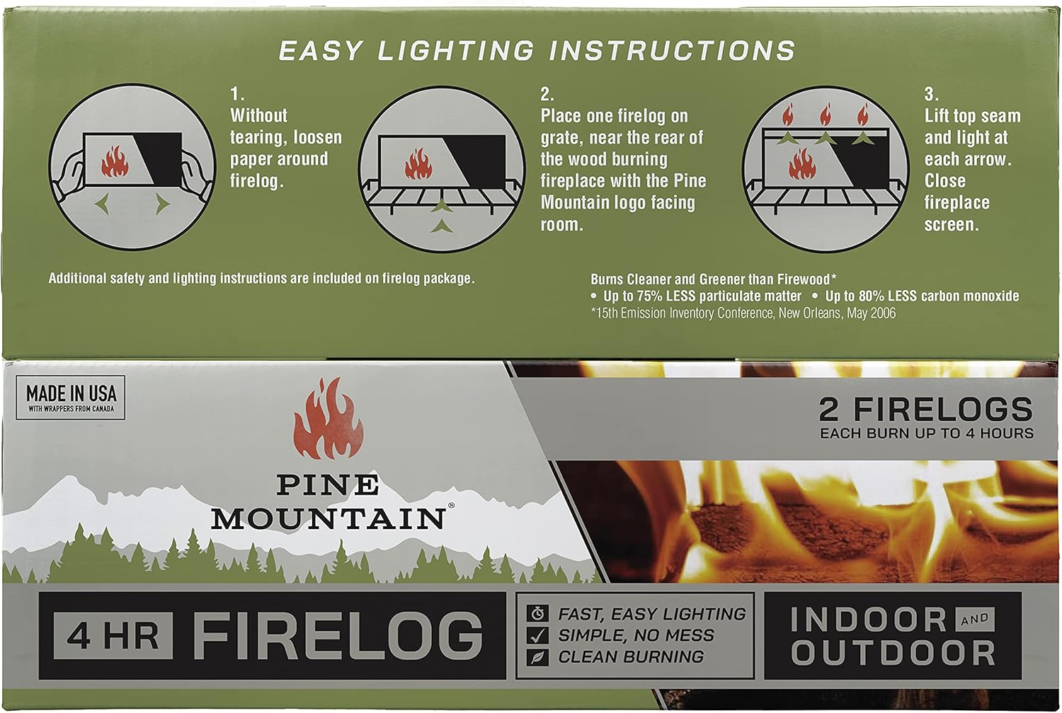 Clean & Green: Our firelogs burn cleaner than firewood, producing up to 80% less carbon monoxide and 75% less particulate matter.* Nearly all the materials in our products are made from renewable resources so you can be sure that your choice is a clean one. *Burns cleaner than ordinary cordwood, producing up to 75% less particulate matter and up to 80% less carbon monoxide”, 15th Emission Inventory Conference, New Orleans, May 2006.”