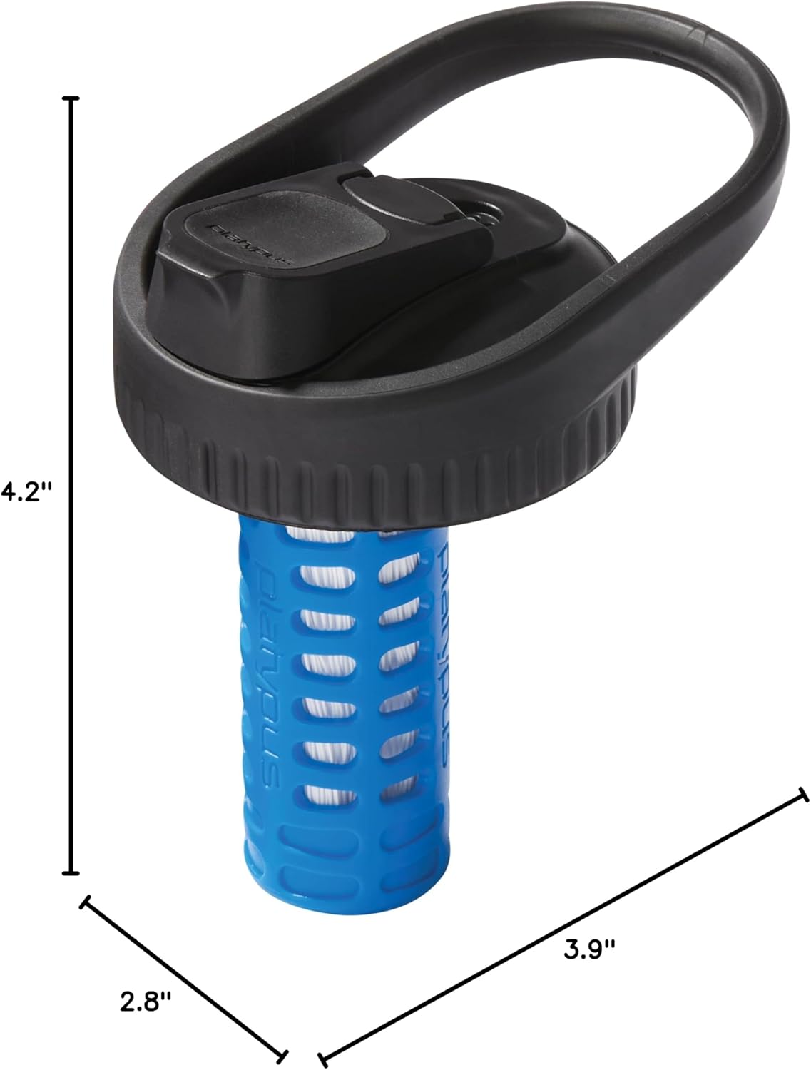 Filter is detachable with a simple quarter-turn, allowing for spout-only use. Spout is optimized for drinking or pouring, while the carry loop is semi-flexible and sturdy