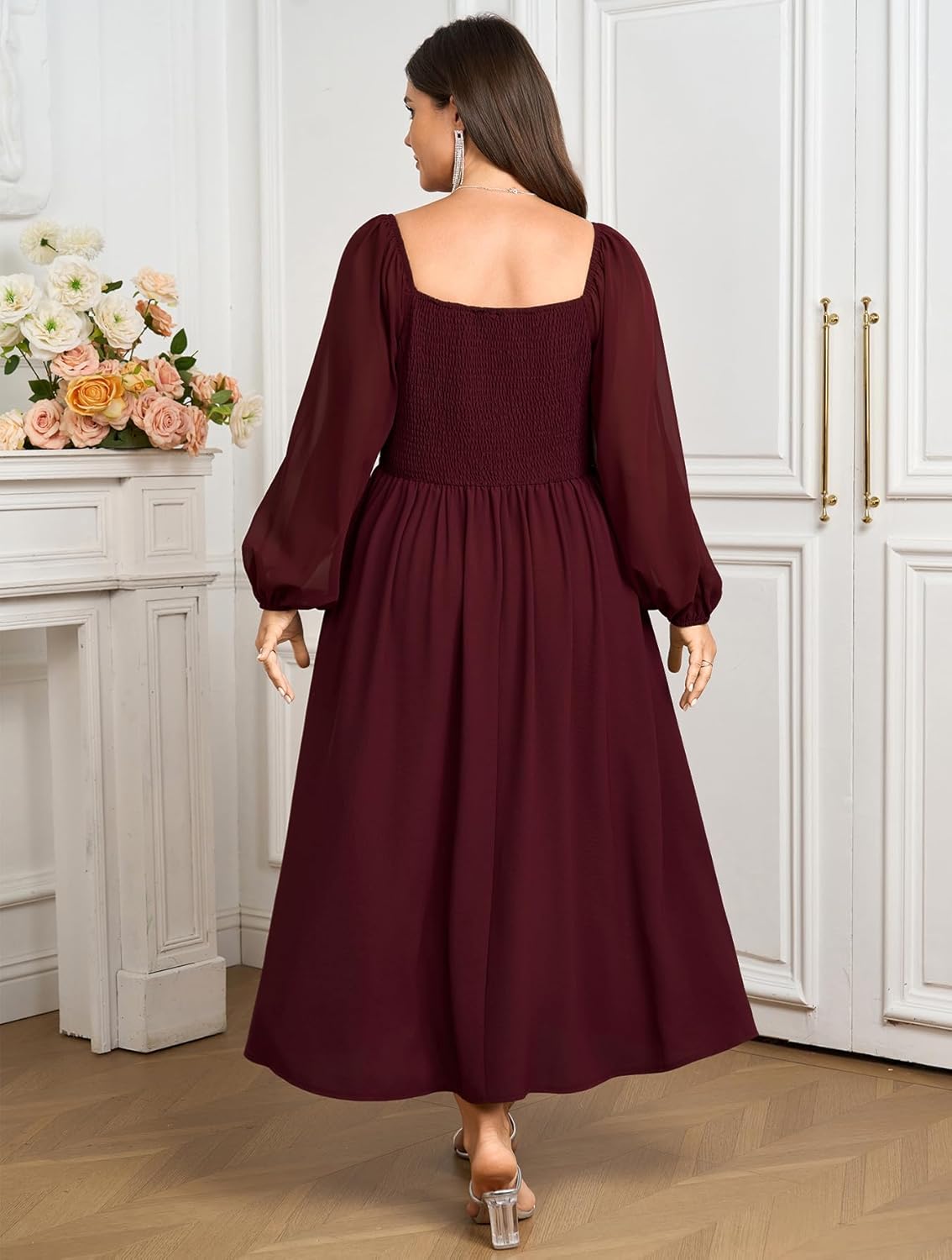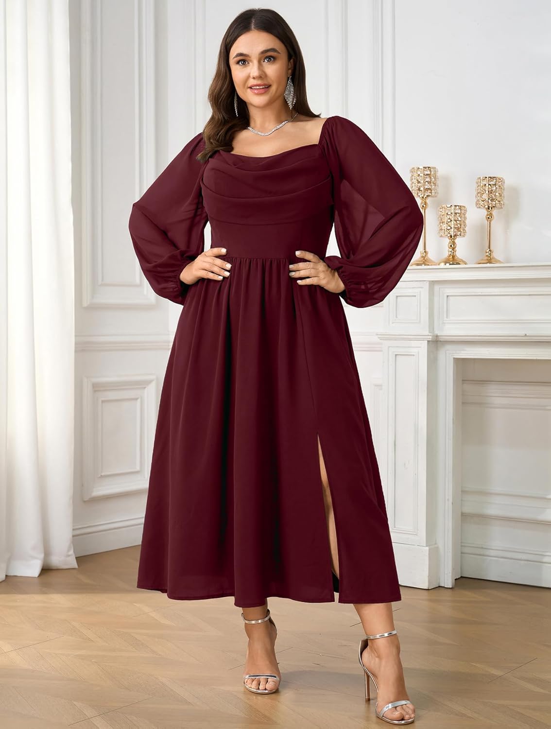 Plus Size Dresses for Curvy Women Cowl Neck Chiffon Long Sleeve Formal Dress