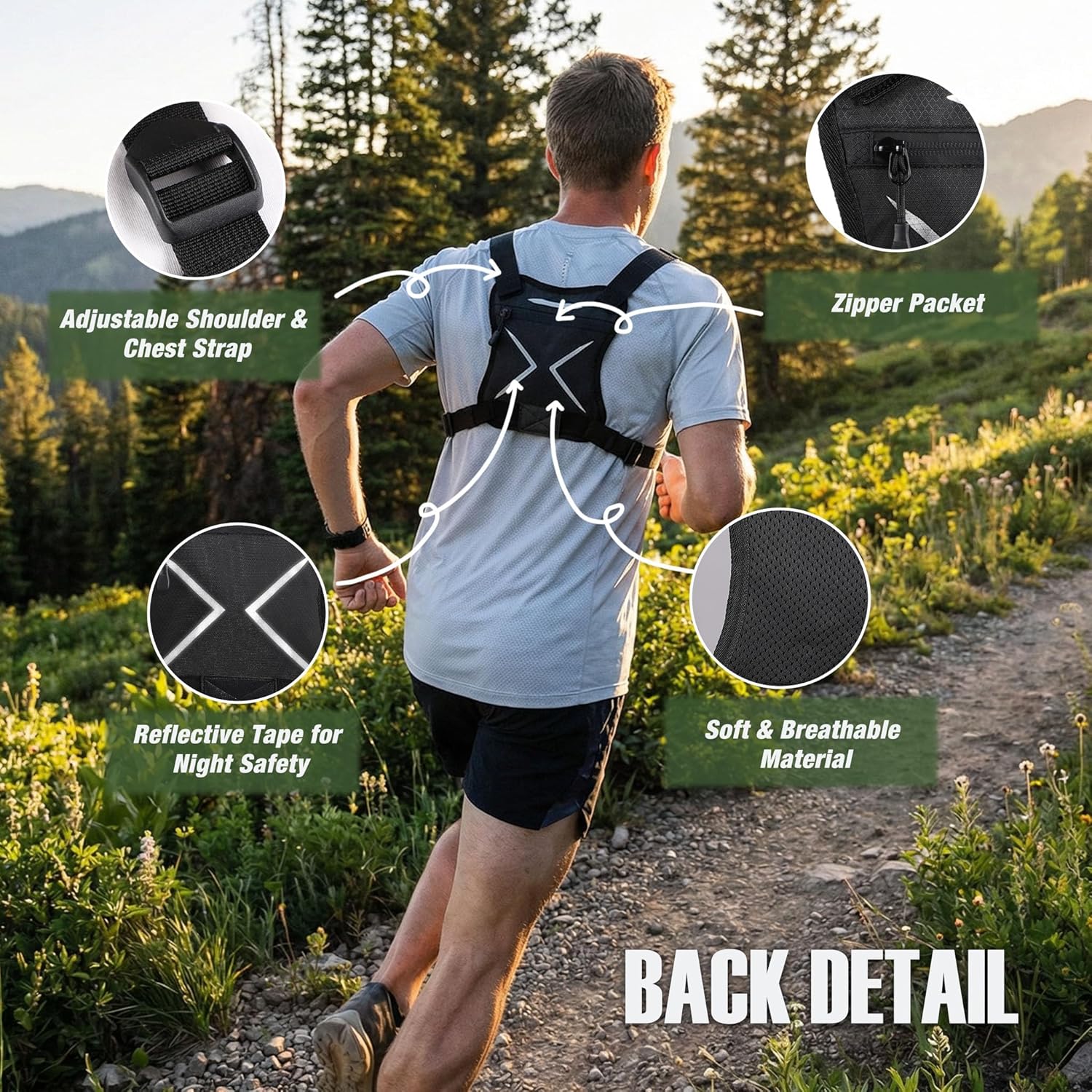 “Designed for outdoor enthusiasts, this running chest pack for men features comfortable, breathable yet waterproof fabric with an ergonomic build. You’ll barely notice you’re wearing it – whether you’re out for a run or tackling outdoor adventures, it moves with you effortlessly.”