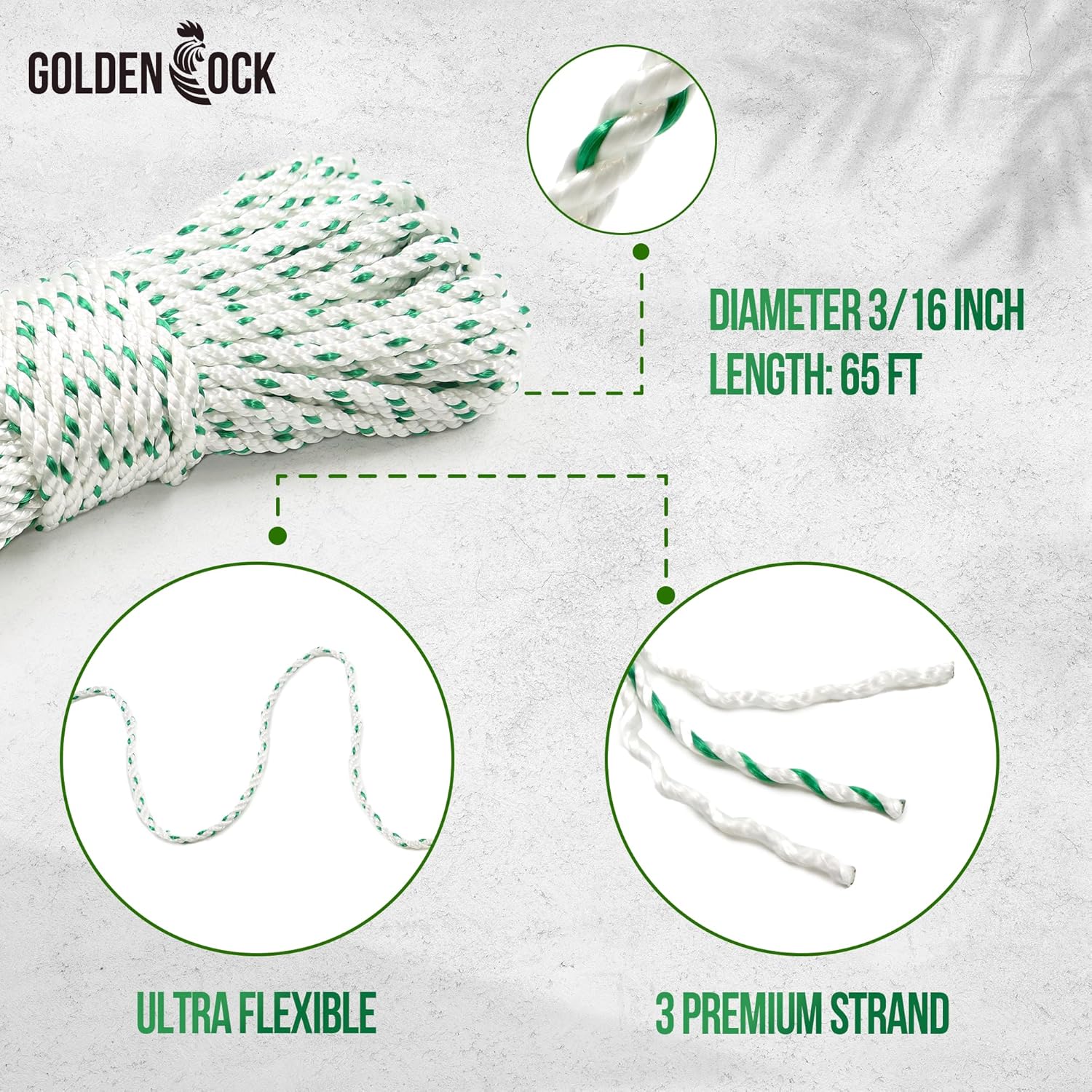 Size & Length : 3/16 inch (5mm) diameter, 65 feet (20 meters) long, ideal for versatile applications.