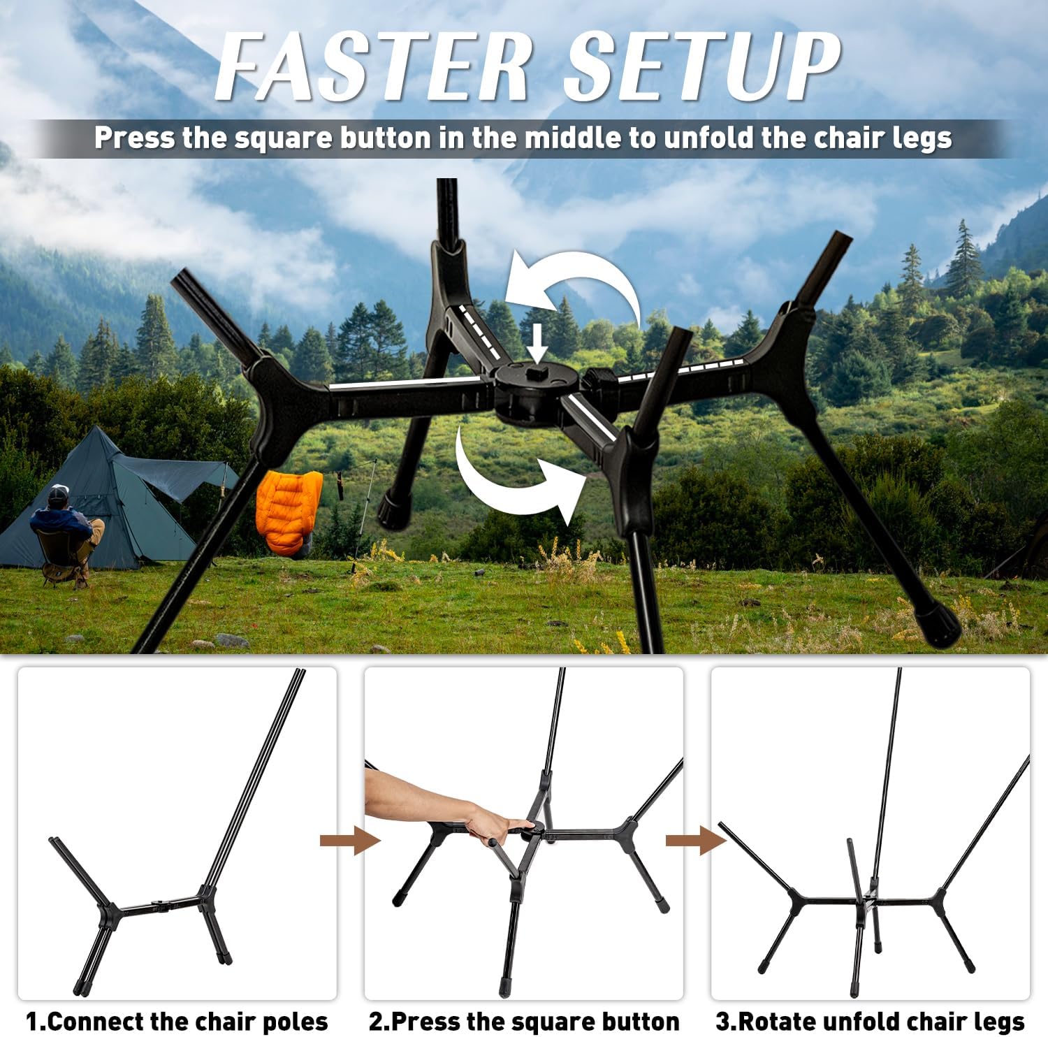 【Quick Setup】This lightweight folding chair is quick and easy to assemble, taking only 1 minute! A square button in the center of the chair frame allows you to open the chair legs 90 degrees with a simple press, then fasten the four corners of the chair fabric into the legs. No tools are needed; just a few simple steps for quick assembly, allowing you to easily enjoy every journey.