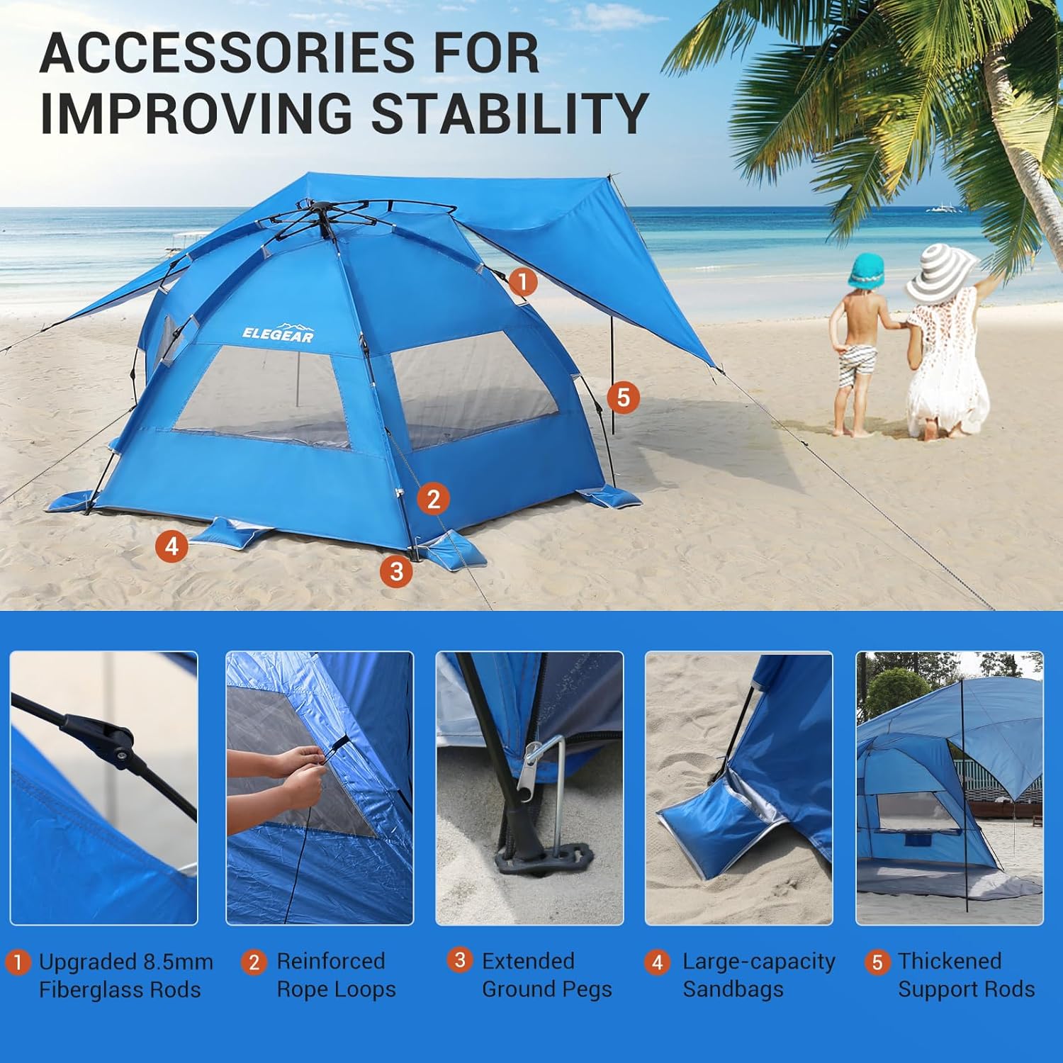 One-second Installation – Elegear Beach Canopy Tent boasts a patented automatic spring-loaded pole system that allows for effortless 1-second setup and takedown, so you can spend less time fussing with your tent and more time enjoying the sun and sand. Plus, our tent’s portable carrying bag makes outdoor transportation a breeze.