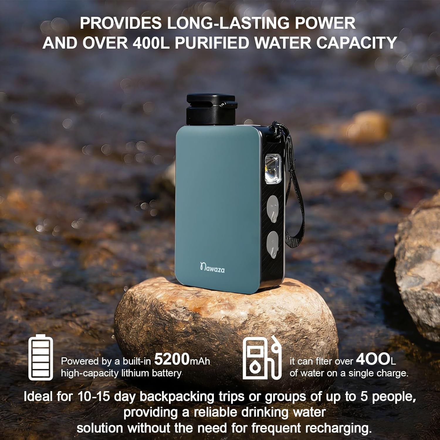 This long-distance adventure water purifier features a 5200mAh high-capacity battery, capable of filtering over 400 liters ofwater on a single charge, meeting the water needs of a 5-person team or a 10-15 day solo trip.
