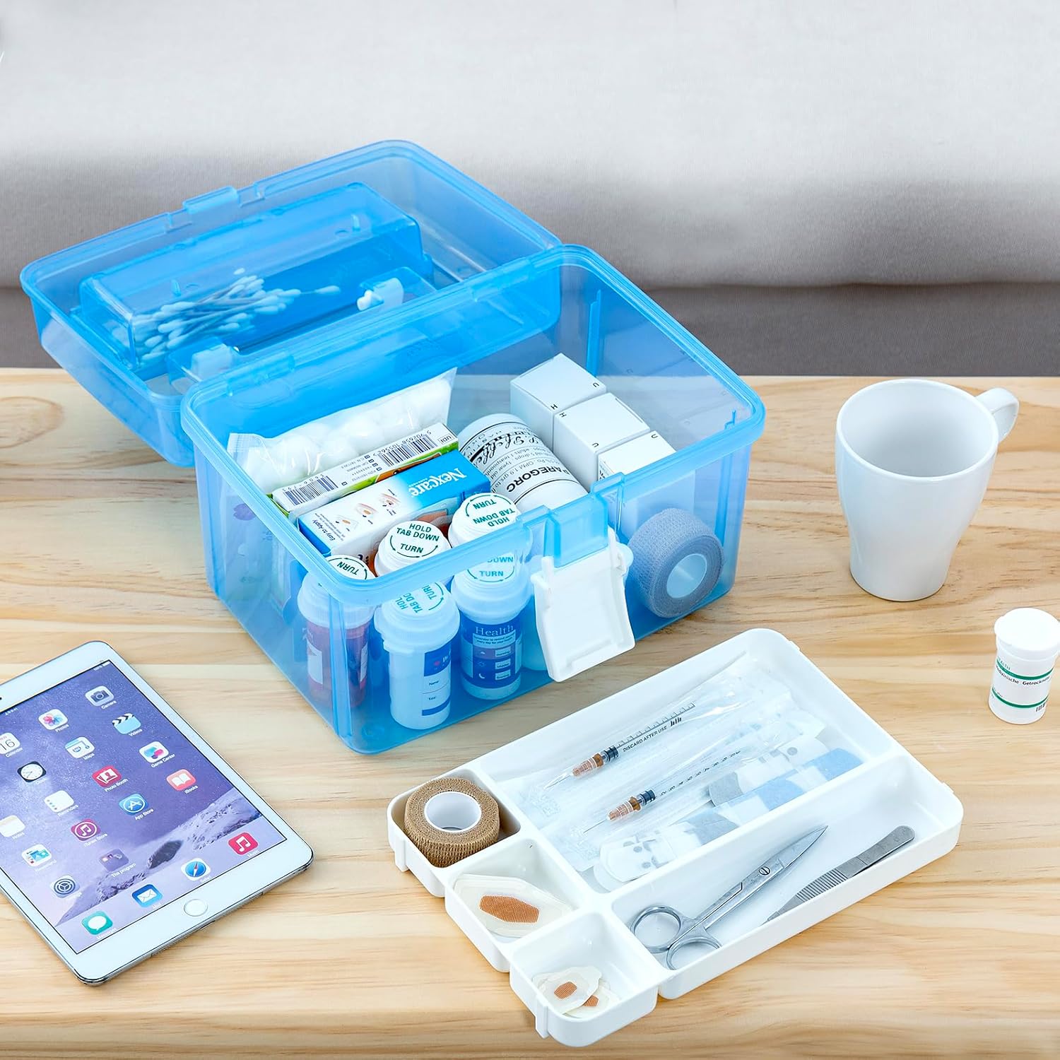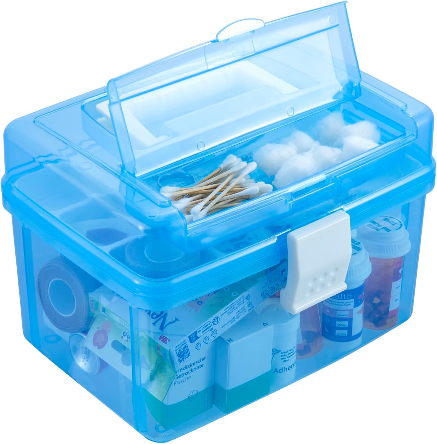 Simplify emergency preparation with this 10-inch transparent blue storage box—designed to keep medicine and first aid items easily accessible. An indispensable companion, this durable bin offers secure and organized containment for medical essentials. Not limited to medical use, this empty multipurpose caddy doubles as a toolbox, tackle box, or hobby case, storing everything from art supplies and sewing kits to small toys, jewelry, makeup, hair accessories, and bathroom toiletries neatly arranged.