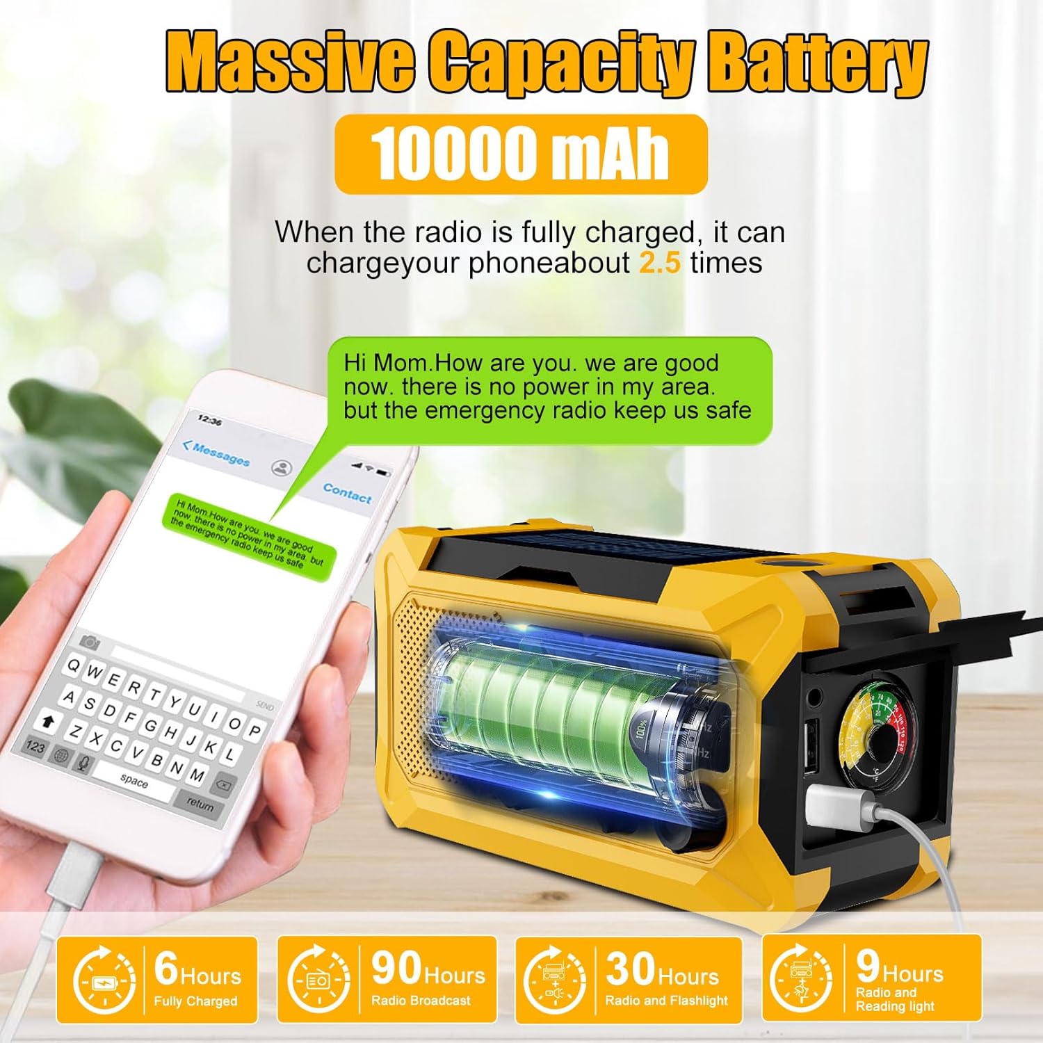 3 TYPE POWER SOURCE:Compared with other NOAA emergency weather radios, the built-in 10000mAh rechargeable battery, the emergency hand crank radio with led flashlight is easily recharged by solar/hand crank/power plug(not included)and USB cord(included). No more power failure concerns in any situation. The fully charged emergency radio hand crank will last up to 90 hours only playing FM radio.No matter what emergency situation you find yourself in, this hand-crank radio never runs out of power.