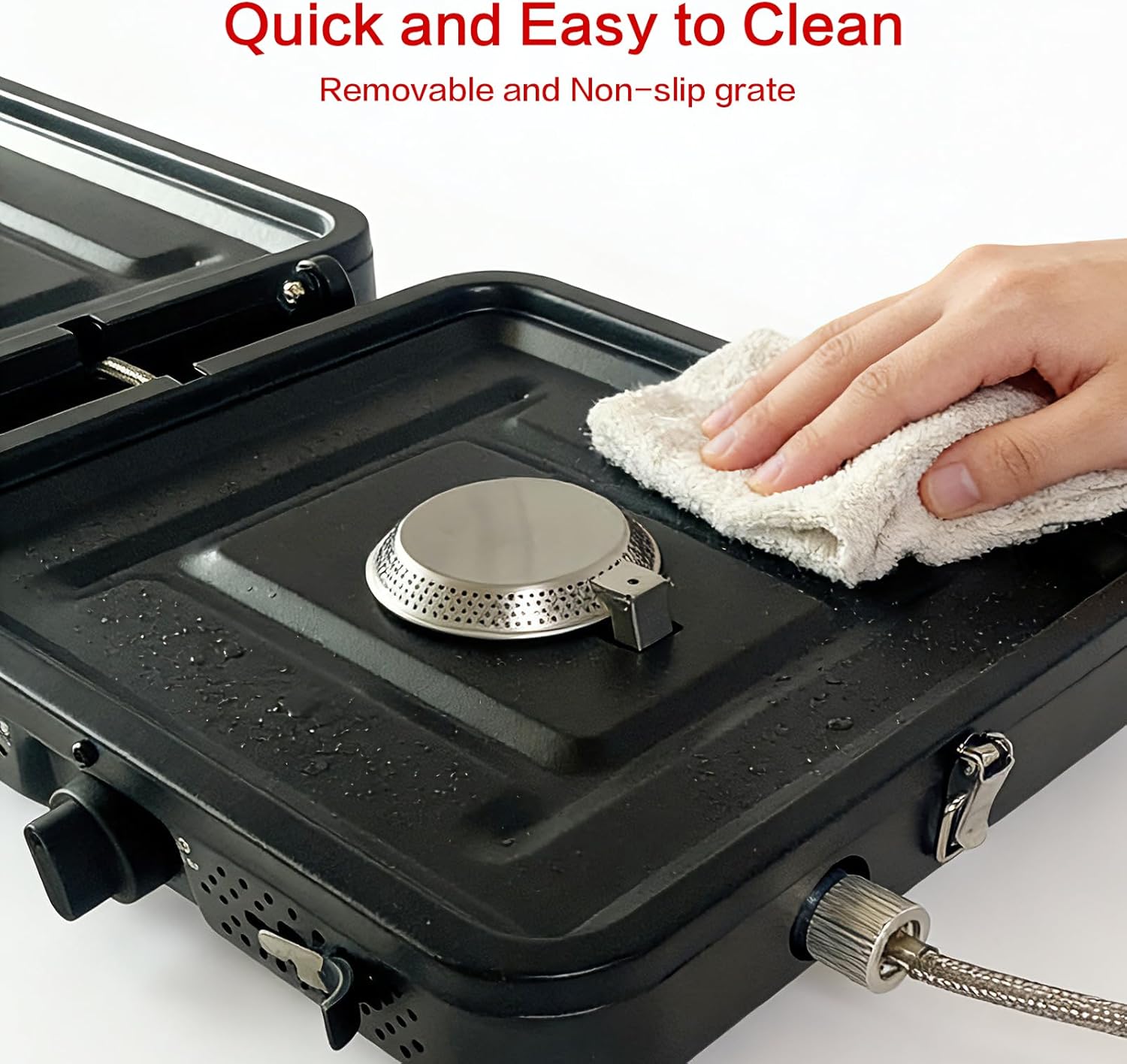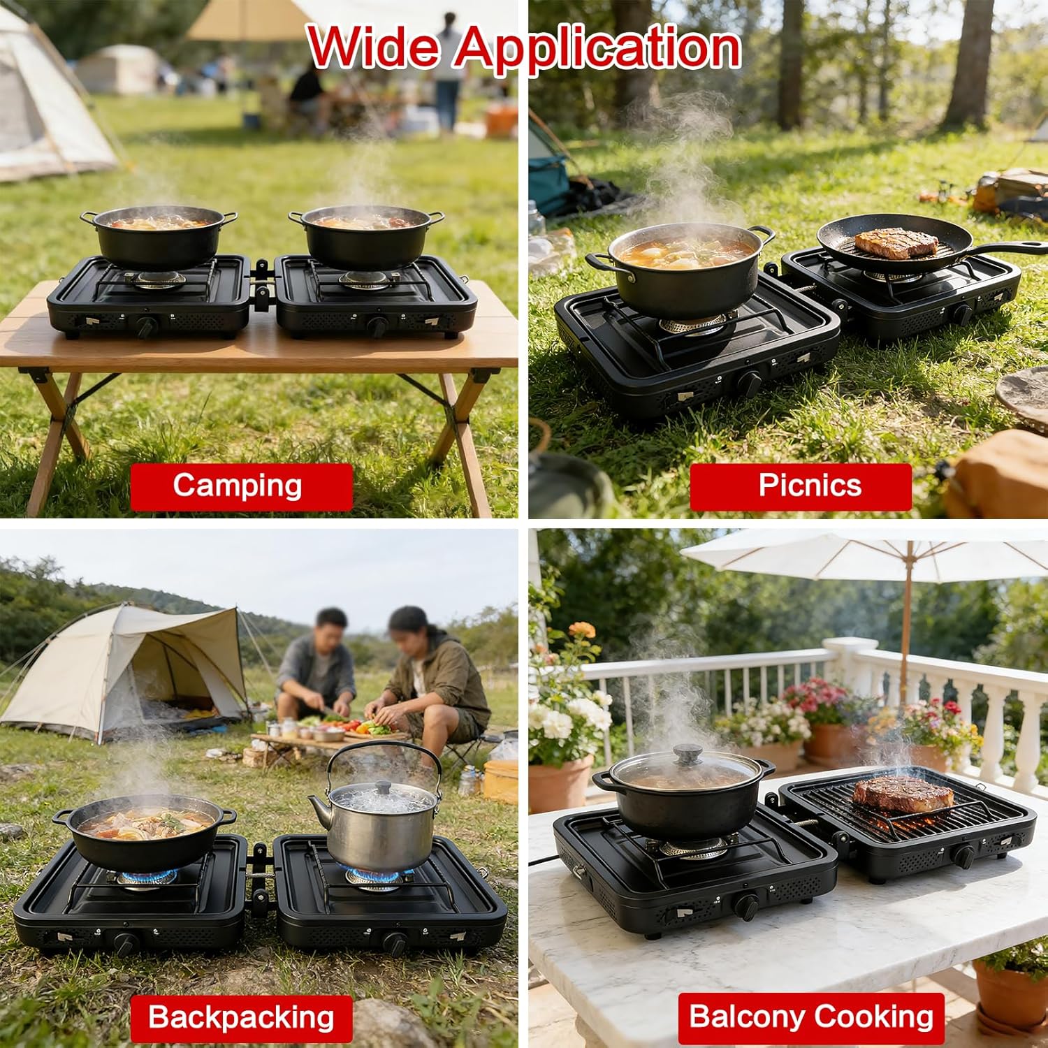 Built To Last:The 2 burner camping stove are made of rust-resistant, heat-resistant stainless steel with matte frosted shell surface,delivers strong and even heat for flexible outdoor cooking. Boil water on one side while simmering soup or frying steak on the other, saving time and effort