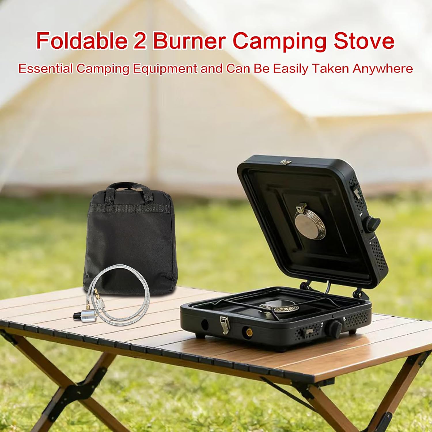 2 Burner Camping Stove:This portable camping stove features two dependently adjustable burners with total output about 17,000 BTU,which delivers powerful heat and convenience you need for outdoor meals, ideal for outdoor cooking,backpacking,picnic,bbq,fishing trips,ect