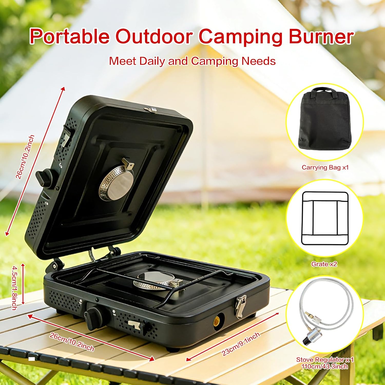 Package Included:1 x camping stove with 2 Burners (Folding), 1 x Stove Regulator, 1 x Carry Bag, 1 x User Manual.Please Note: first use, you may need to press the ignition button about 3-5 times for the flow.This camping essentials perfect for preparing coffee, full meals during camping trips, picnics, or backyard gatherings