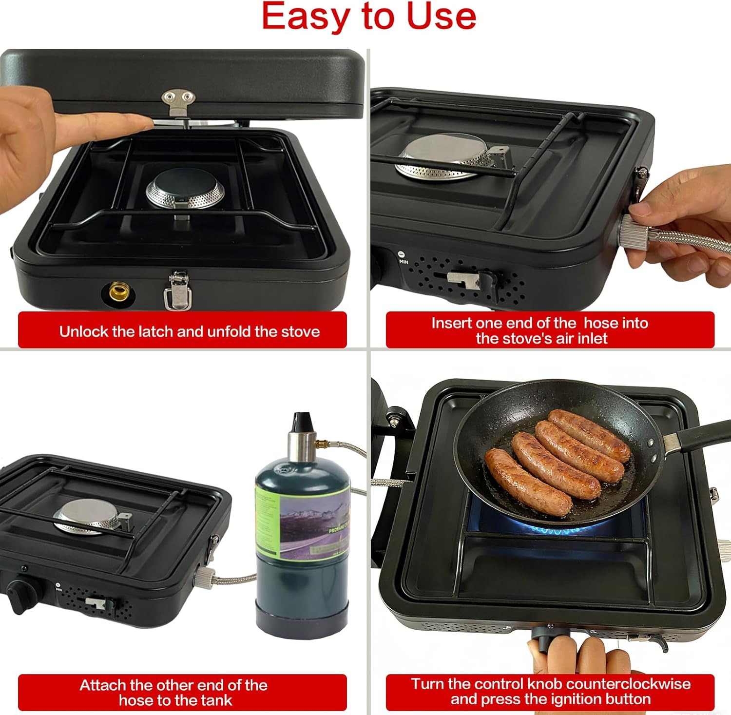 Foldable & Lightweight :Our camp stove with a foldable structure ,which makes storing and transporting this camping stove effortless. Comes with a carry bag, perfect for flexible outdoor cooking and a must-have among your camping essentials