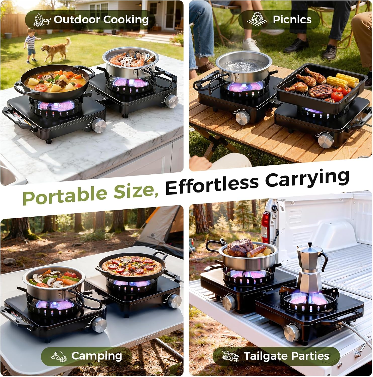 Ultra-Efficient Precision Temperature Control Burners: Equipped with 2 burners featuring dual infrared heating and open flame modes, this camping stove delivers a total output of 36,000 BTU. Both burners have independent temperature controls for rapid heating and can boil 1L of water in just 3 minutes. The dual-burner design enables simultaneous cooking of multiple dishes, effortlessly meeting camping and outdoor cooking needs while delivering piping-hot meals instantly.