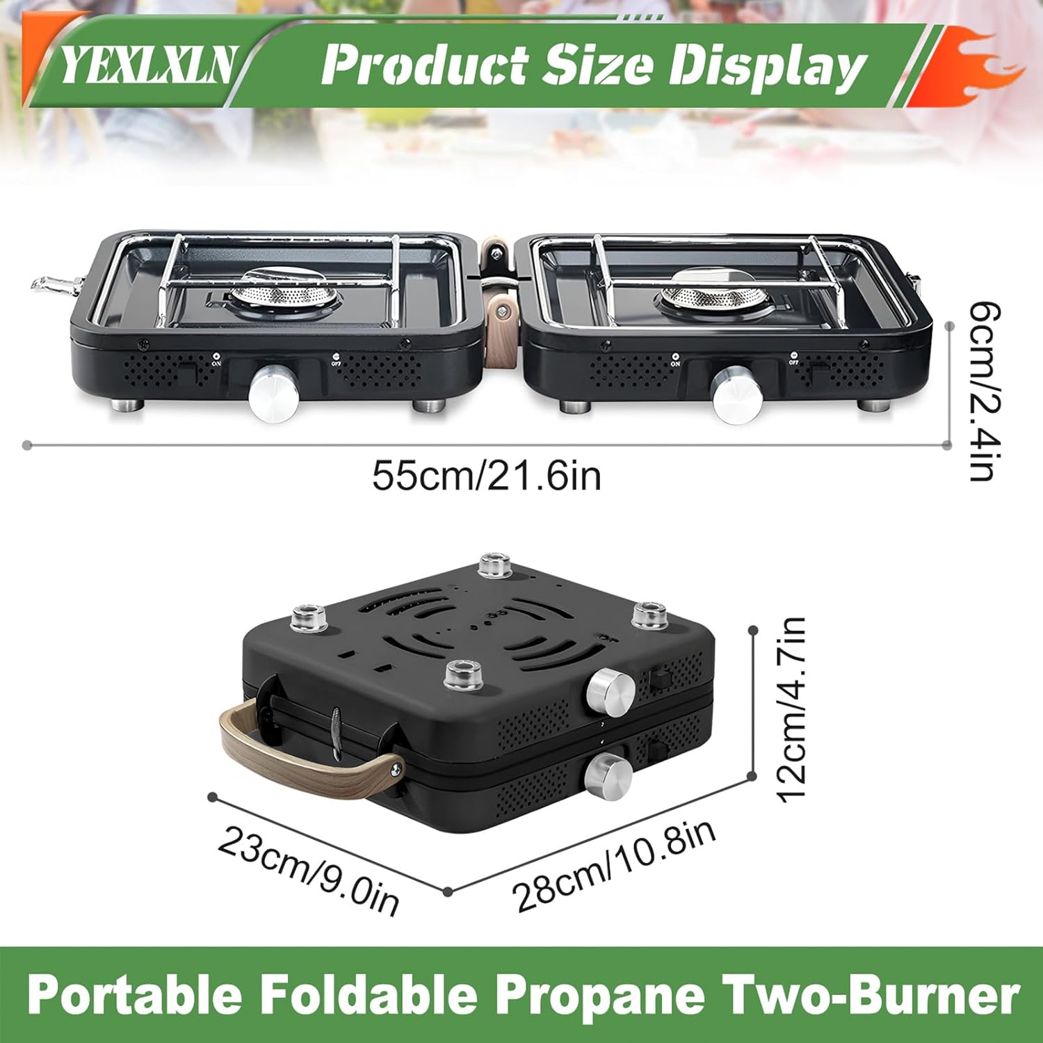 ●【Double Burner Camp Stove】Featuring two adjustable burners, this propane camping stove offers the flexibility to cook multiple dishes simultaneously. Whether you’re brewing coffee or frying up some eggs, you can manage your camp kitchen efficiently