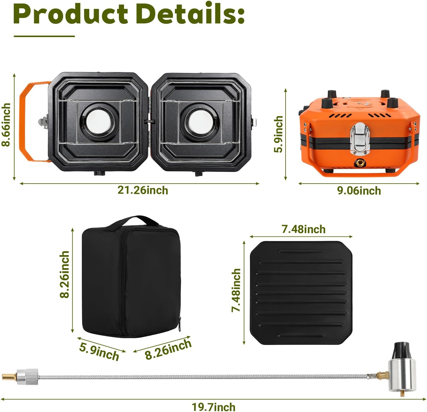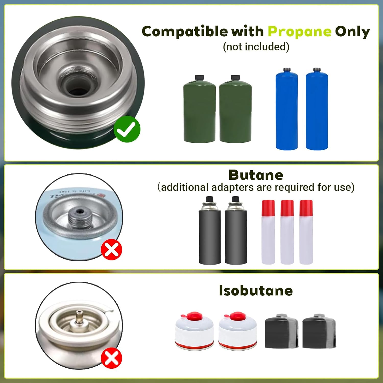 🛡️SAFETY DESIGN– The portable camping stove compatible with propane cylinders(not included). Equipped with flame-out protection technology that instantly shuts off the gas supply when wind blows out the flame, preventing gas waste.19.7-inch fuel hose keeps propane tanks a safe distance away from overheating risks.