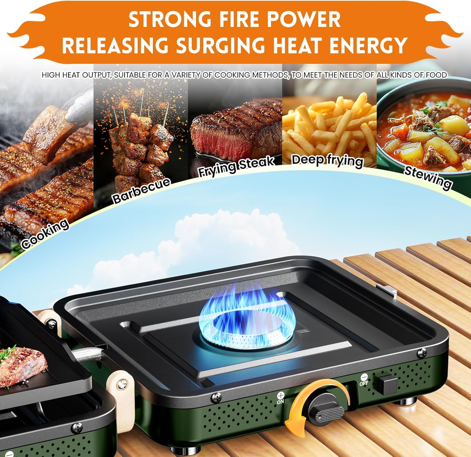 POWERFUL & PRECISE BURNERS:This propane stove for camping features two powerful, adjustable burners. Whether you’re simmering a sauce or boiling water rapidly, these burners handle it well. As a high – performance camp stove propane, it offers consistent heat output. The user – friendly control knobs let you precisely regulate the flame. Whether you’re a pro camper or a beginner, this stove’s burners will meet your cooking demands during your camping trips.