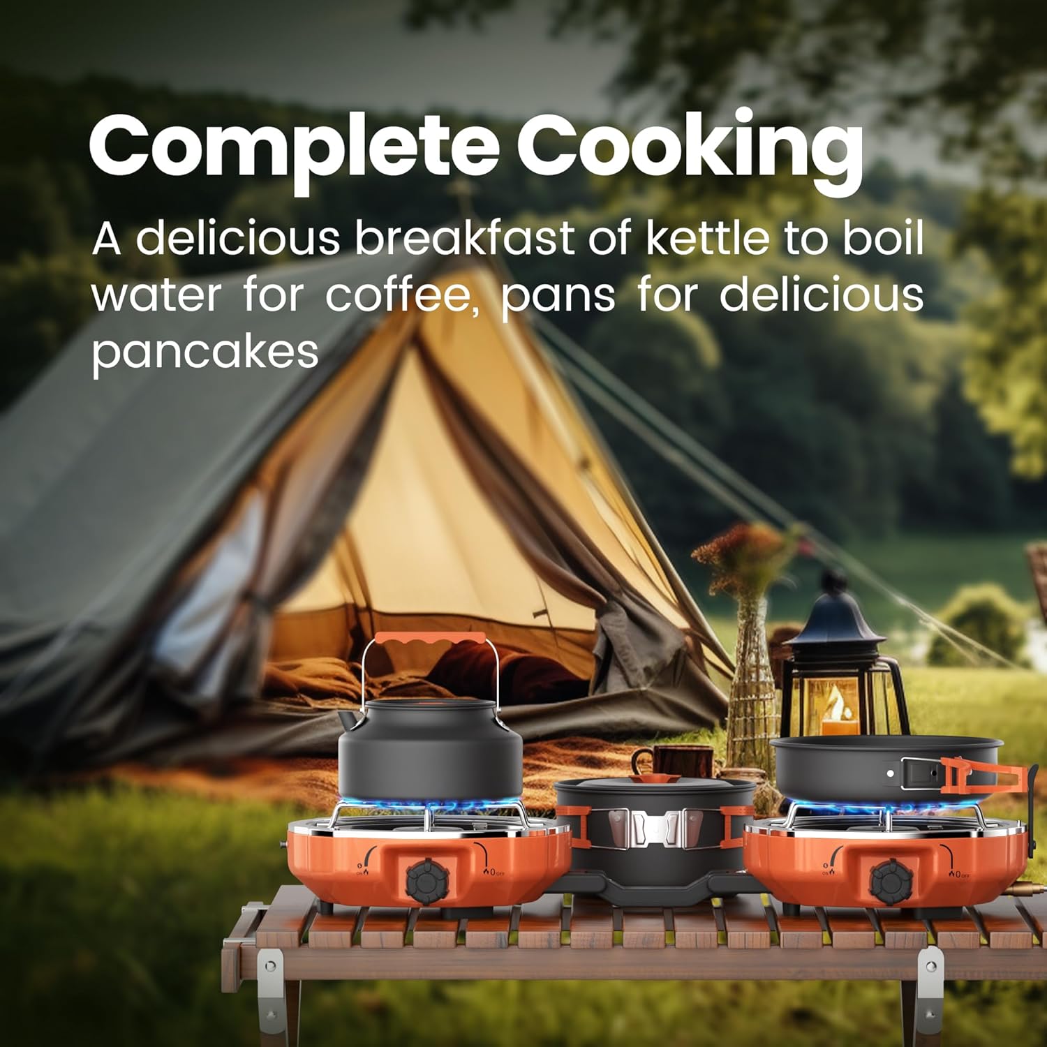 [ In The Package]: Includes 1 x COFIYARD Camping Gas Stove with 2 Burners (Folding), 1 x COFIYARD Gas Stove Connector, 1 x COFIYARD Woven Carry Bag, 1 x User Manual, 1 x Pot, 1 x Frying Pan, 1 x Kettle, and 1 x Mesh Bag