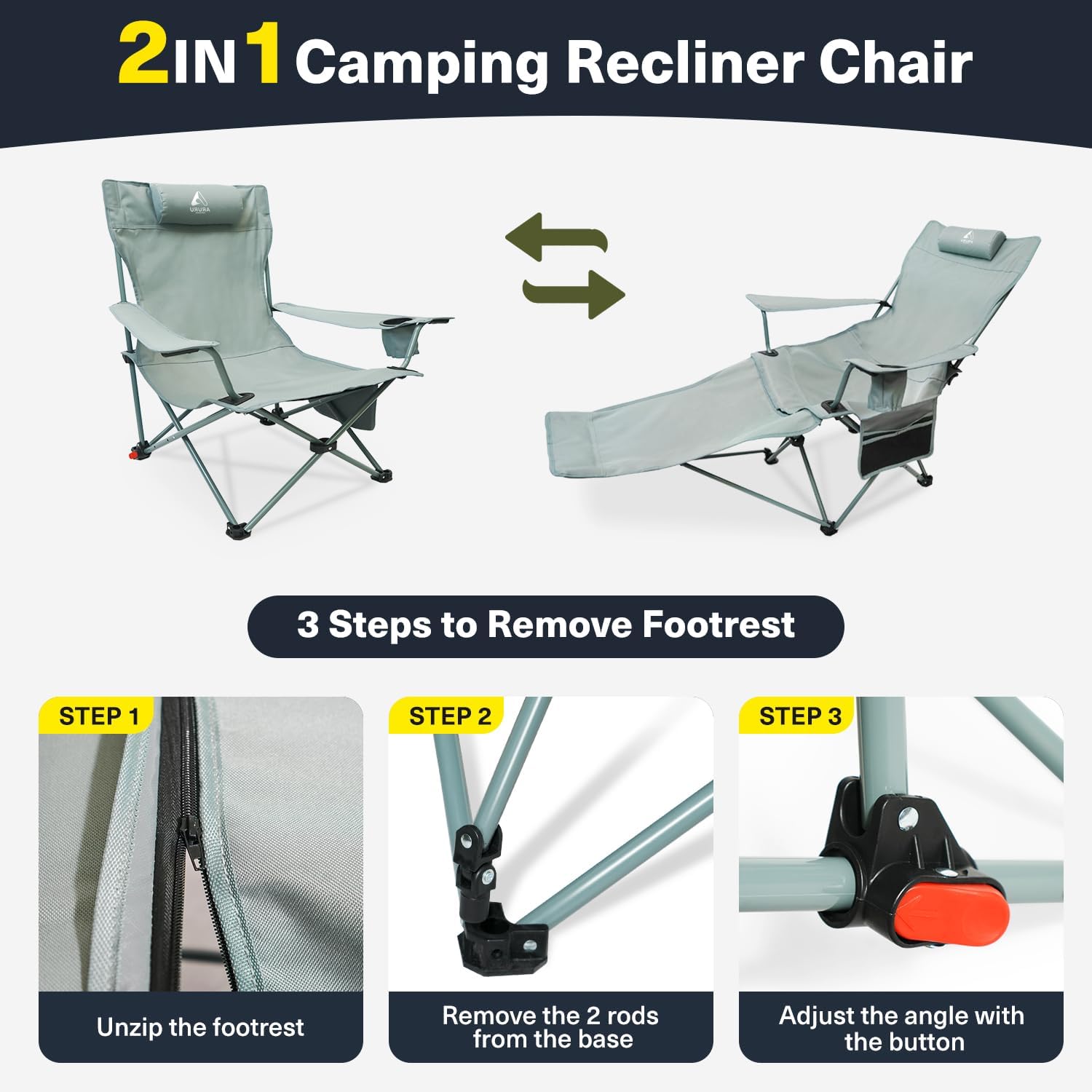 2-in-1 Reclining Camping Chair with Footrest: This versatile camping chair combines the functionality of both a reclining lounge chair and a folding camping chair. The retractable footrest allows for ultimate relaxation, and the adjustable backrest offers 3 different reclining angles for comfort during any outdoor activity like camping, beach trips, or picnics.