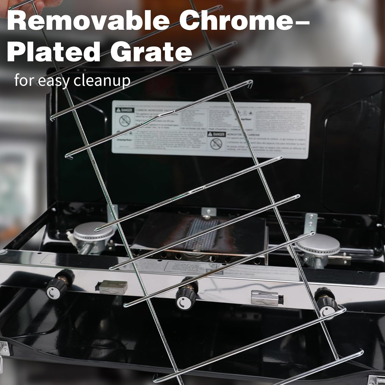 PORTABLE: This 3-burner portable camping stove features a convenient carry handle, enabling effortless transportation. With a compact structure and a lightweight of only 10 lbs, it’s incredibly easy to carry. It can be conveniently placed in a luggage, storage box, or even a large tote bag, making it a breeze to take along on your adventures. Dimensions: 23.4”x12.8”x3.4”. Weight: 9.9 LB