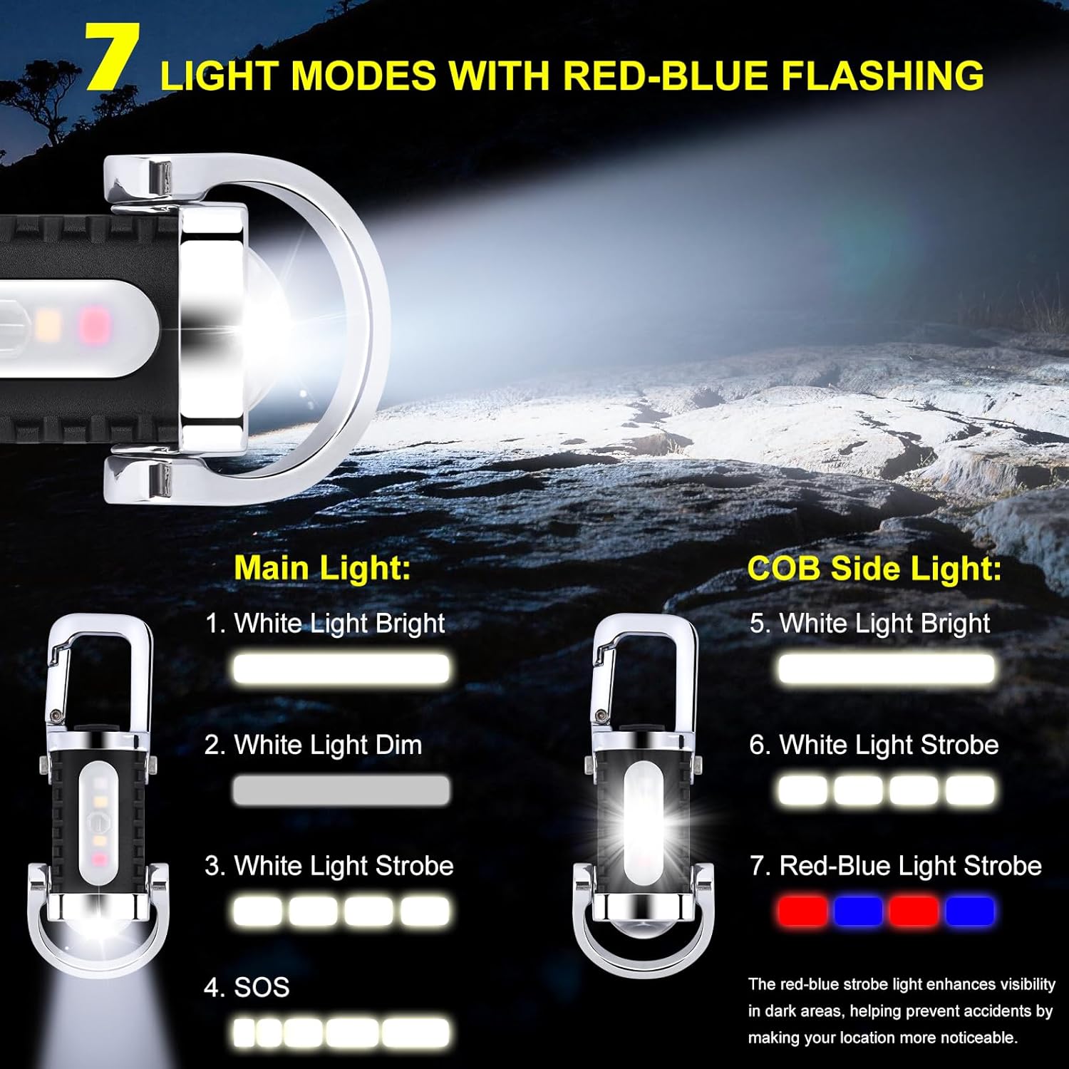 7 Versatile Modes with Enhanced Safety Features:This bright keychain light offers distinct lighting options to suit any situation. The main LED provides High, Low, Strobe, and SOS white light. The innovative COB side lamp adds a broad, even light, its own strobe, and a highly visible Red & Blue flashing mode to increase your visibility and safety in dark environments.
