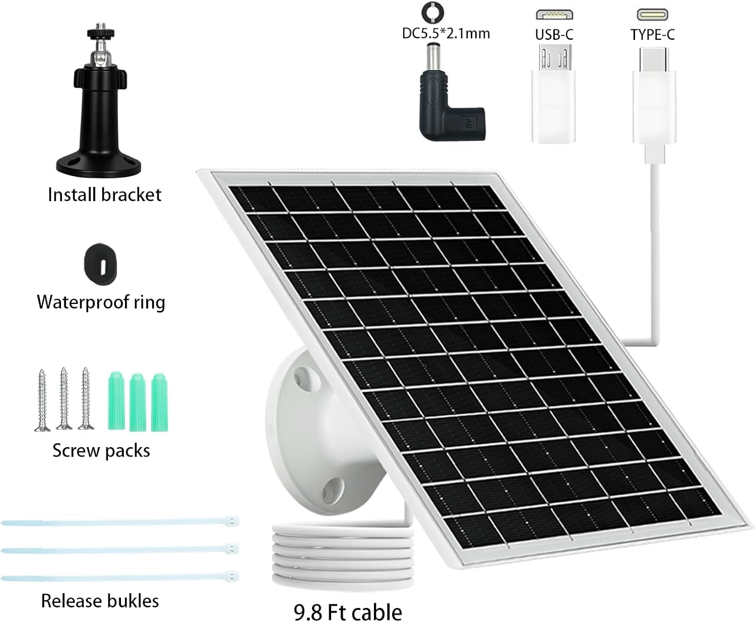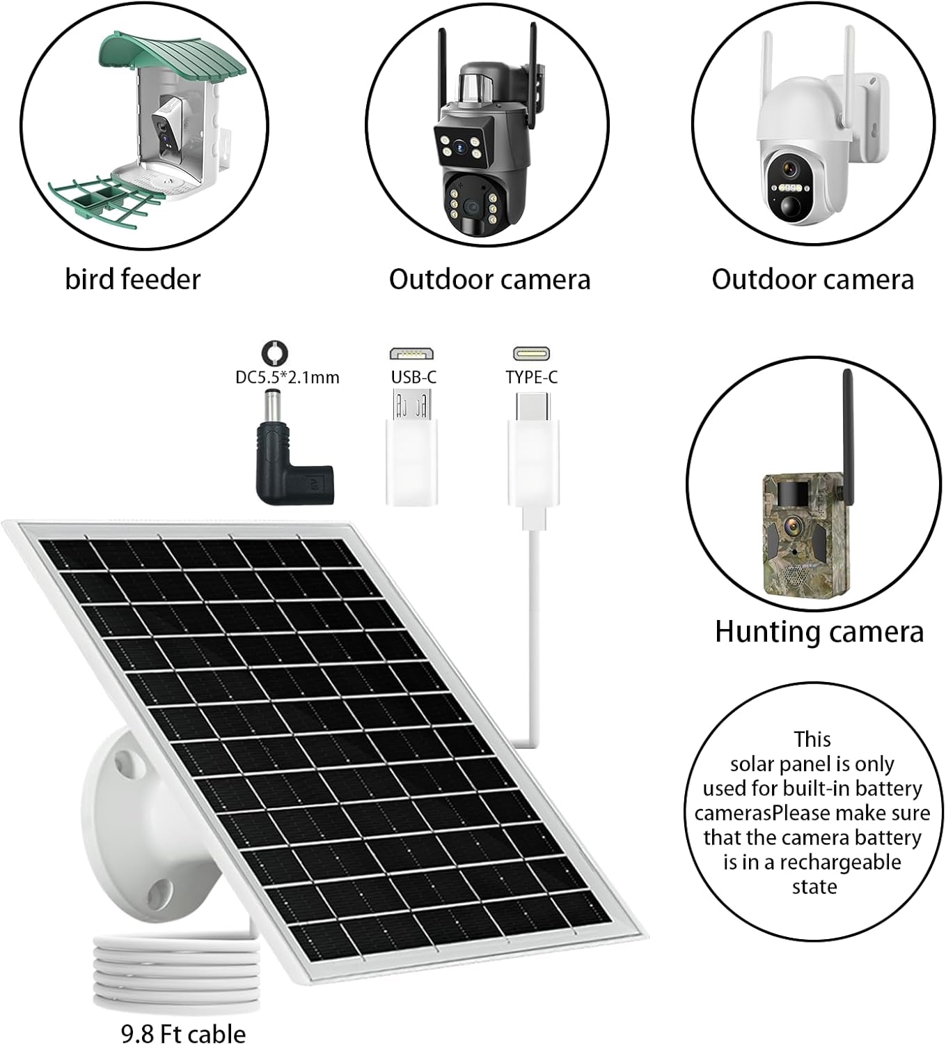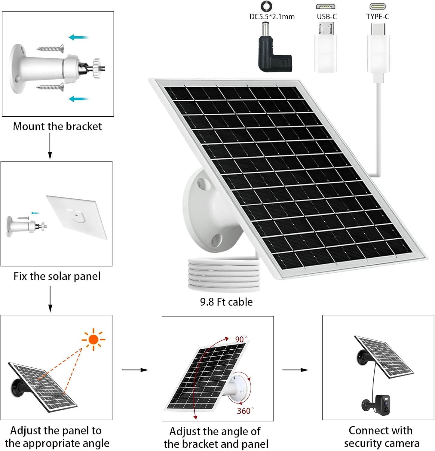 【IP65 WATERPROOF】This outdoor security camera solar panel is IP65 waterproof, which can completely prevent sand and dust from entering,suitable for outdoor installation.The 360 ° adjustable bracket ensure the angel of maximal sunlight exposure. The 9.8ft charging cable is paired with the original USB C interface for easy connection to charging devices. We provide the silicone waterproof ring,effectively solving the problem of water leakage at the interface
