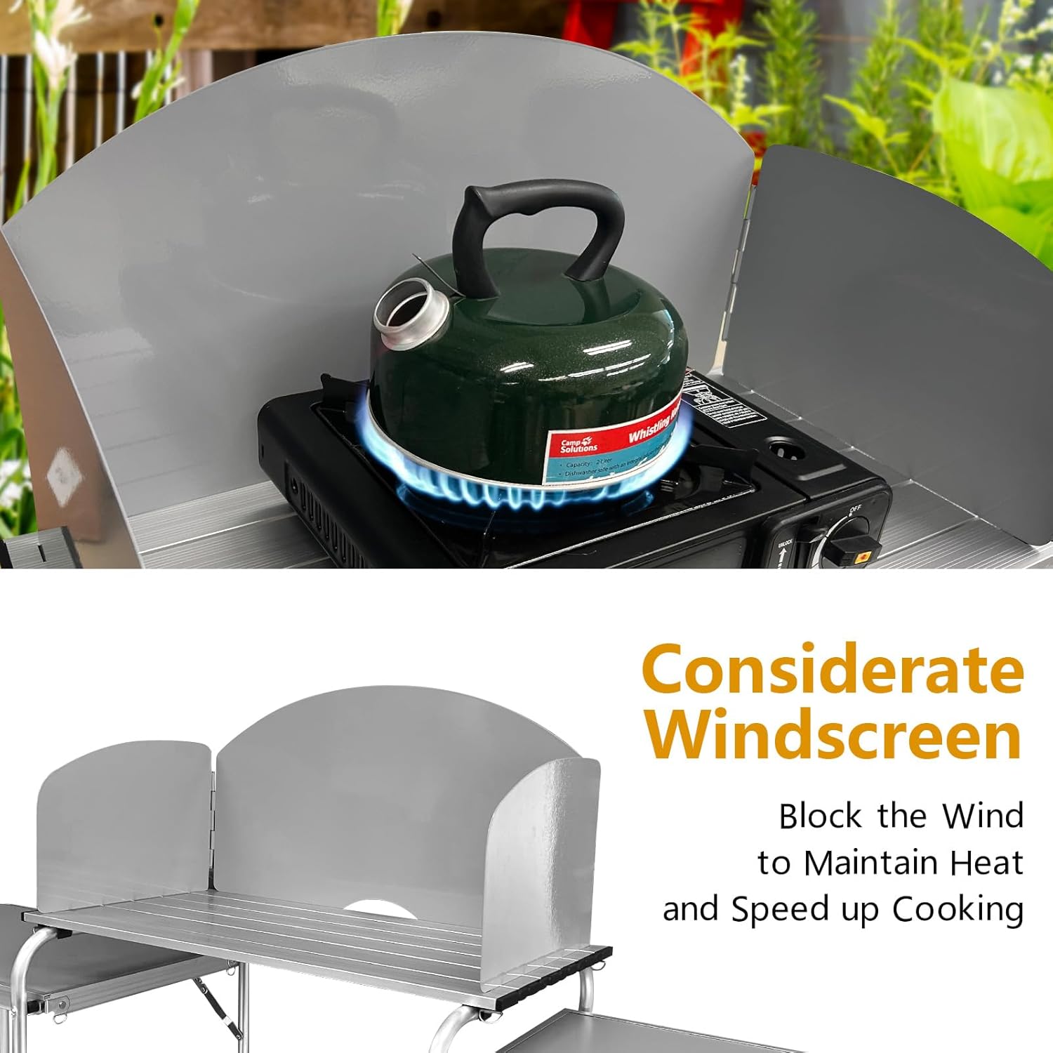 Well-designed & Premium Material Camp Table – Steel windscreen on the countertop table blocks the wind for heat retention and ensures more effective burning. Aluminum material with PVC Coating makes the portable folding camp kitchen more durable.