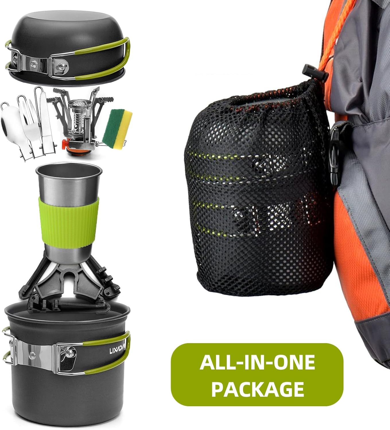 【Package Include】- This camping cooking kit includes Large Pot,Small Pot,Cup,Canister Stand ,Spoon ,Fork,Knife ,Mini Stove,Tableware Storage Bag ,Stove Storage Box,Cleaning Cloth and Fork Spoon Storage Bag(11PCS set)/ This camping cooking kit includes Large Pot,Small Pot and camping Tableware Storage Bag(3PCS set)