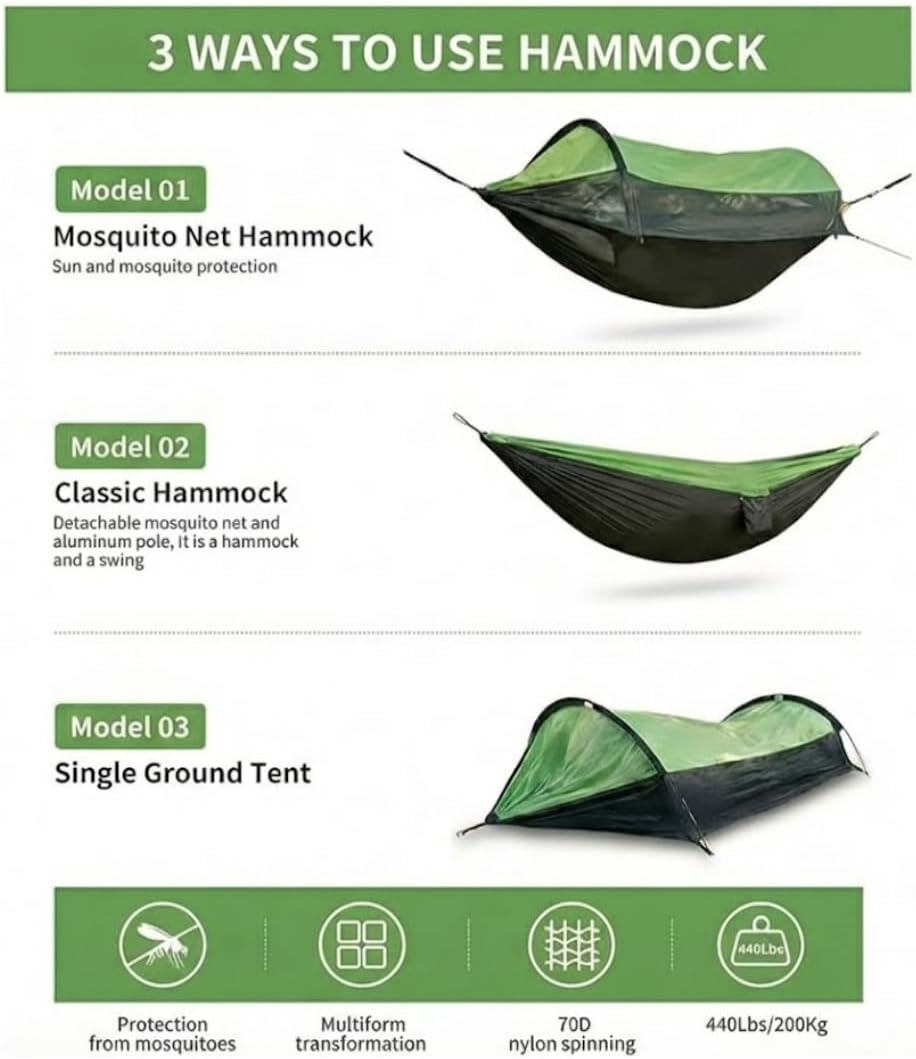 All-in-One Versatility: Combines the functionality of a camping hammock tent and a traditional tent, making it ideal for camping, backpacking, and travel. Ideal for use as a hammock for trees or as a ground tent for varied terrains.