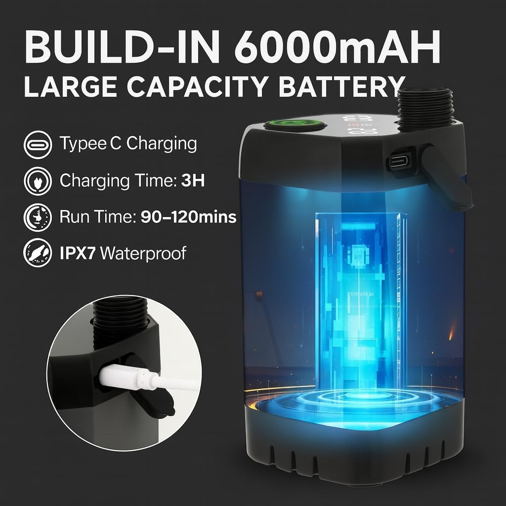 🏕️BATTERY & DIGITAL DISPLAY:USB-C charging with on-screen battery/temp. Typical run time 60–90 min per charge (mode dependent). Works with phone chargers or power banks—your camping shower pump with heater stays ready as a portable camp shower