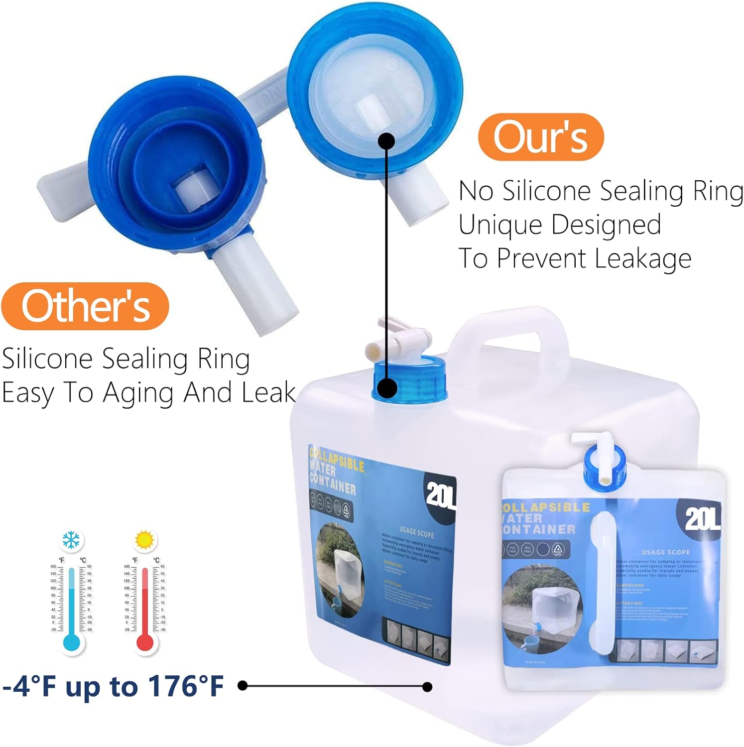 Leakproof Spigot: Unique faucet design, easy on/off designed spigot, Prevent leaking for carrying water, no fuss for water scattering everywhere, you can quickly control the water flow,easy to use.