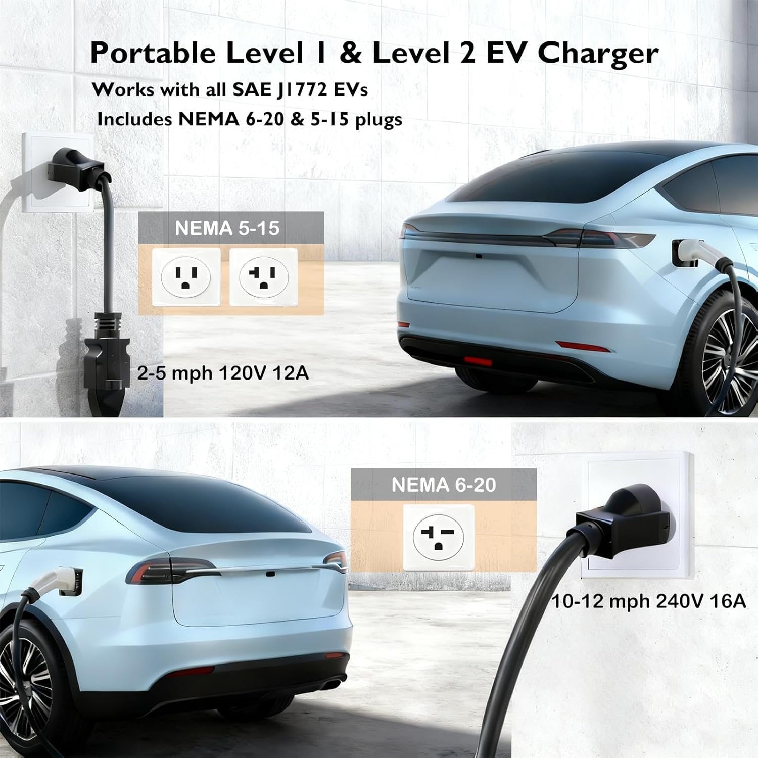 Dual L1/L2 Modes & 25ft Cable for Flexible Charging: This portable EV charger supports Level 1 (110V, NEMA 5-15) and Level 2 (240V, NEMA 6-20), compatible with all J1772 EVs (BMW, Ford, Honda, Hyundai, Kia, Porsche, Nissan, and Chevy, etc.) and Tesla (adapter required, adapter not included). The 25ft extra-long cable lets you reach vehicles parked further away, perfect for driveways or garages