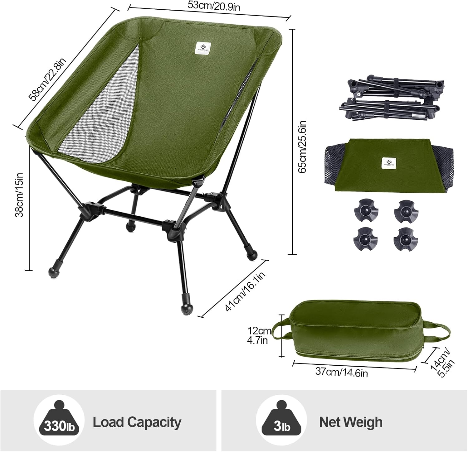 Ultralight and Portable — Weighing merely 3 pounds, this lightweight chair can be effortlessly lifted with one finger. It conveniently folds into a compact carrying bag smaller than a shoebox, allowing for easy storage and transport in carry-on luggage or daypacks. This makes it an excellent option for campers, hikers, backpackers, climbers, and off-roaders alike.