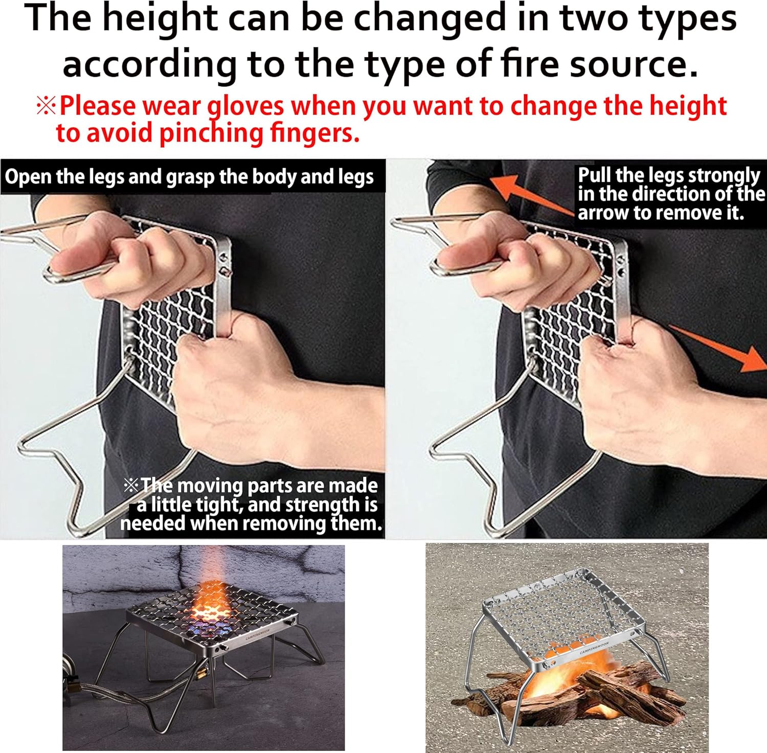 TWO KINDS of HEIGHT The height of this campfire camping grill can be changed in two types according to the type of fire source.You can use this camping grill grate on a camping burner or use it on open fire, fire pit, camp fire etc…