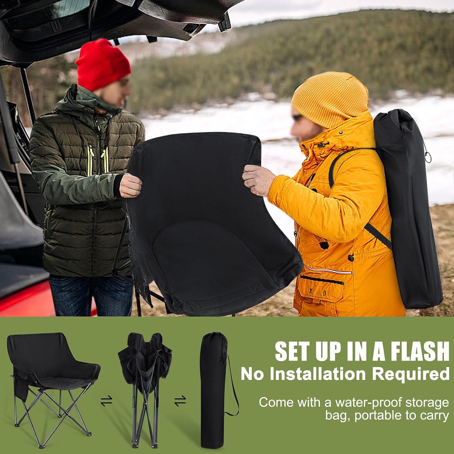 【PORTABLE】 Our outdoor lawn chair is not require assemble, Can be opened and folded up effortlessly in seconds, Measure 20” x 20” x 32” when open and fold up to 6”x 33”, A compact size make them easy to store, Each chair weighs only 6 pounds(2.75KG), Includes a travel drawstring bag with shoulder strap, Allowing you to take them anywhere conveniently