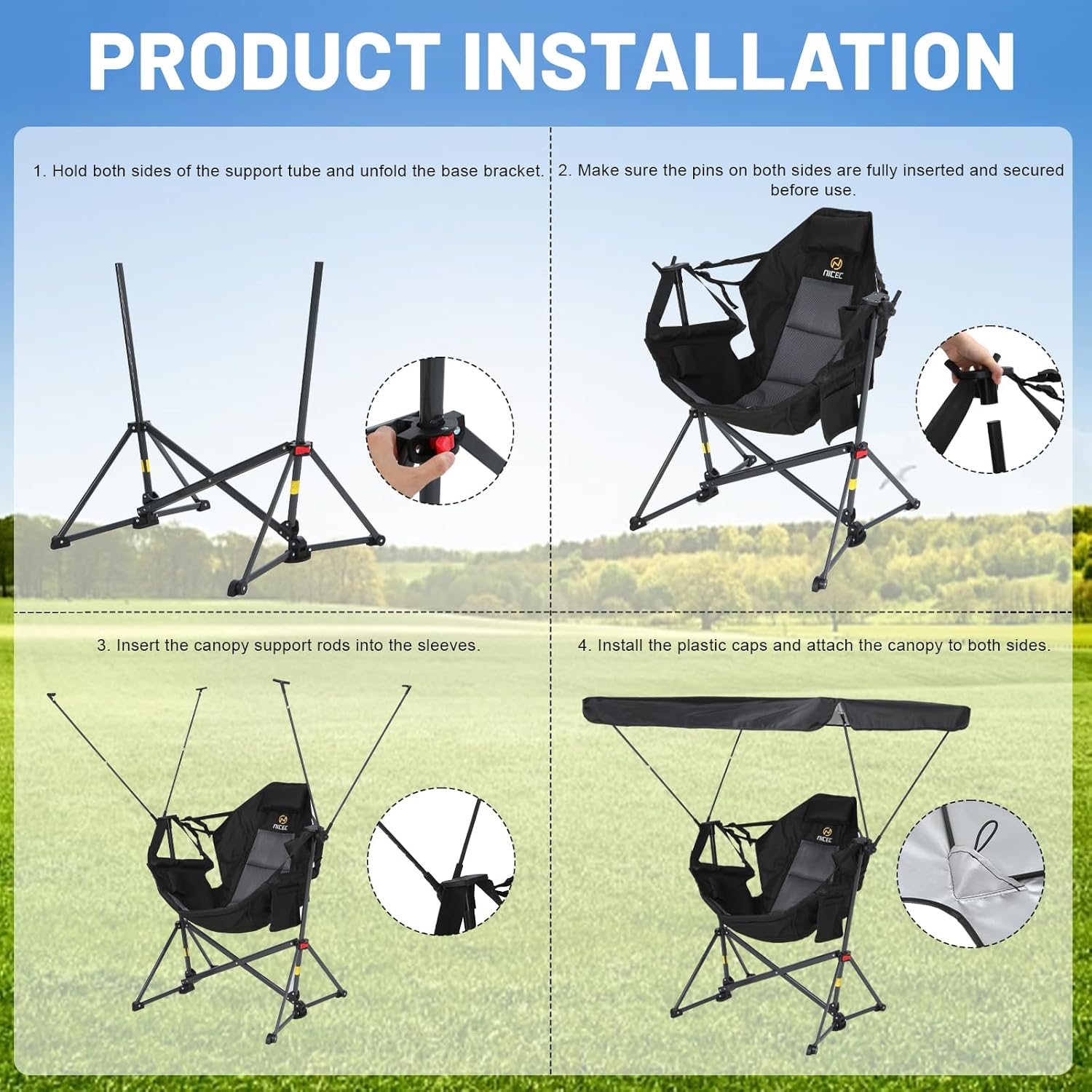 Relax in Style with Hammock Comfort – This hammock-style camping chair offers a suspended, cradling seat design with a wide 35″ backrest and extended footrest, giving you cloud-like comfort anywhere you go.