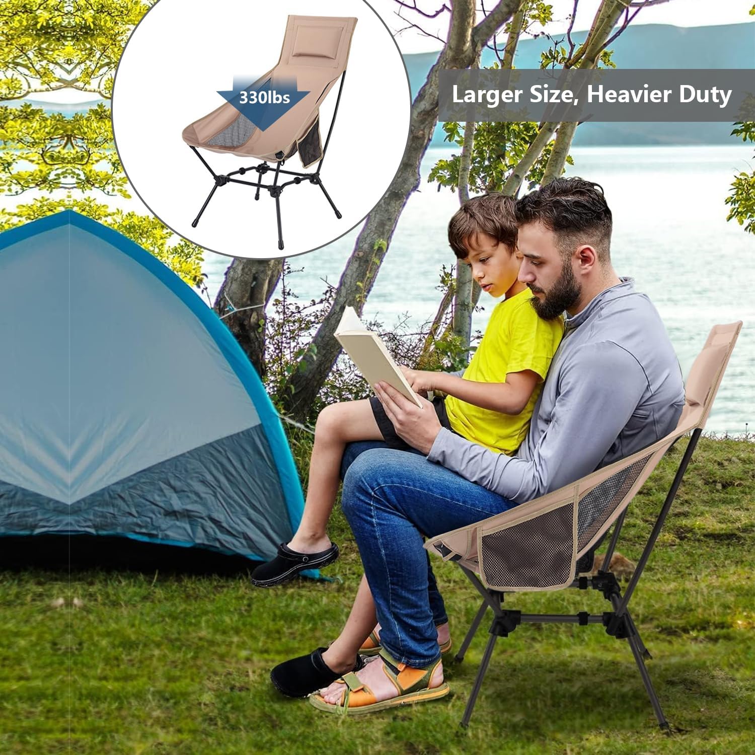 Heavy Duty & Stable: thanks for the thickened steel tube, quad-leg base and triple-lock joints, the chair ensures 360°stability on uneven terrain. The 900D anti-tear Oxford fabric withstands 330lbs loads, paired with non-slip rubber feet for secure placement on wet grass or rocky surfaces.