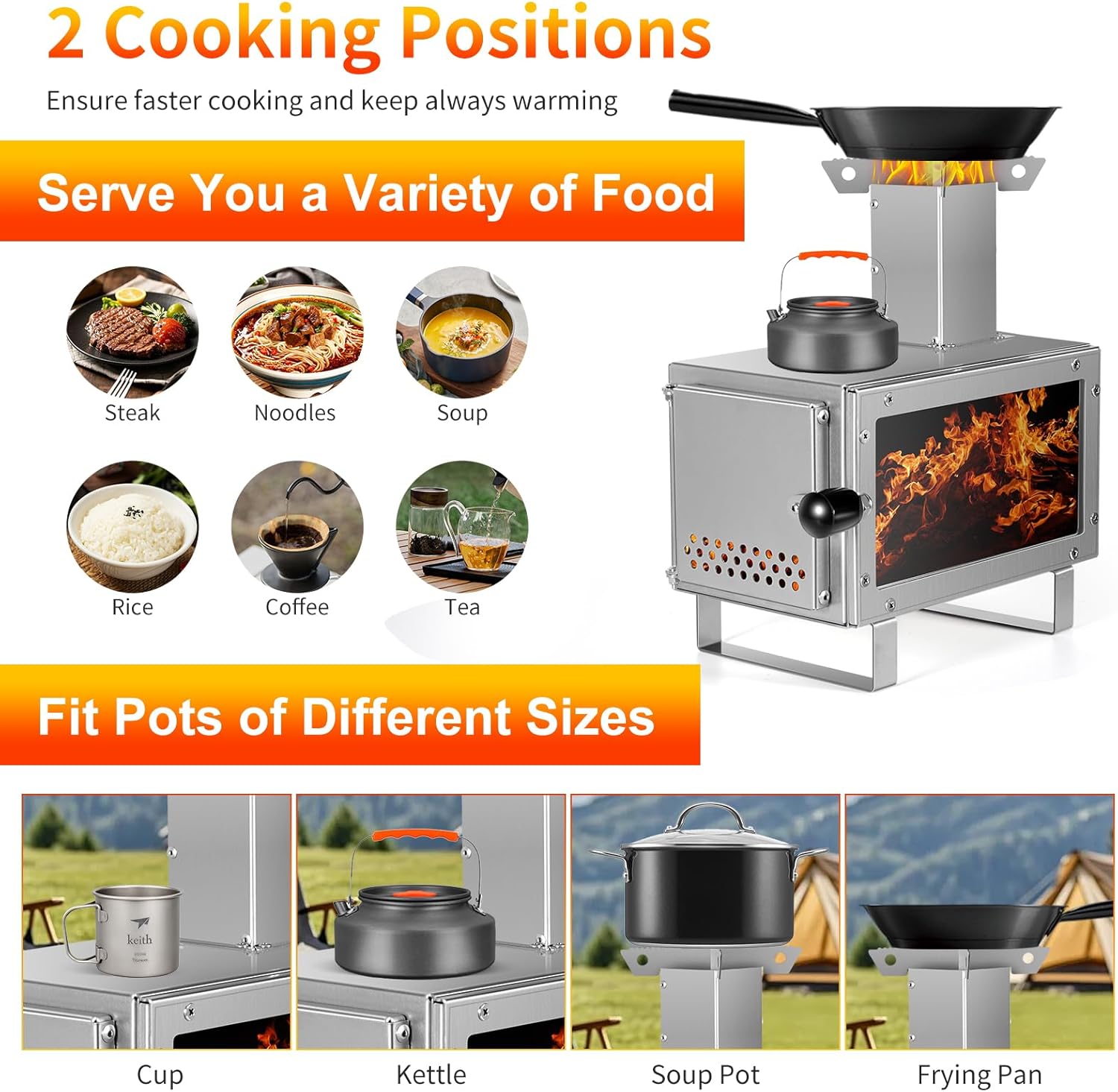 Efficient Burning Stove- air vents of our camping stove are designed for good ventilation and efficient burning. Its large-capacity combustion chamber can be burned for about 40-60 minutes when filled with firewood at one time. The side glass is designed as a fire-viewing window, so you can directly see the flames. It uses 1000°C resistant microcrystalline glass. You can boil water or cook while watching the campfire and relaxing.