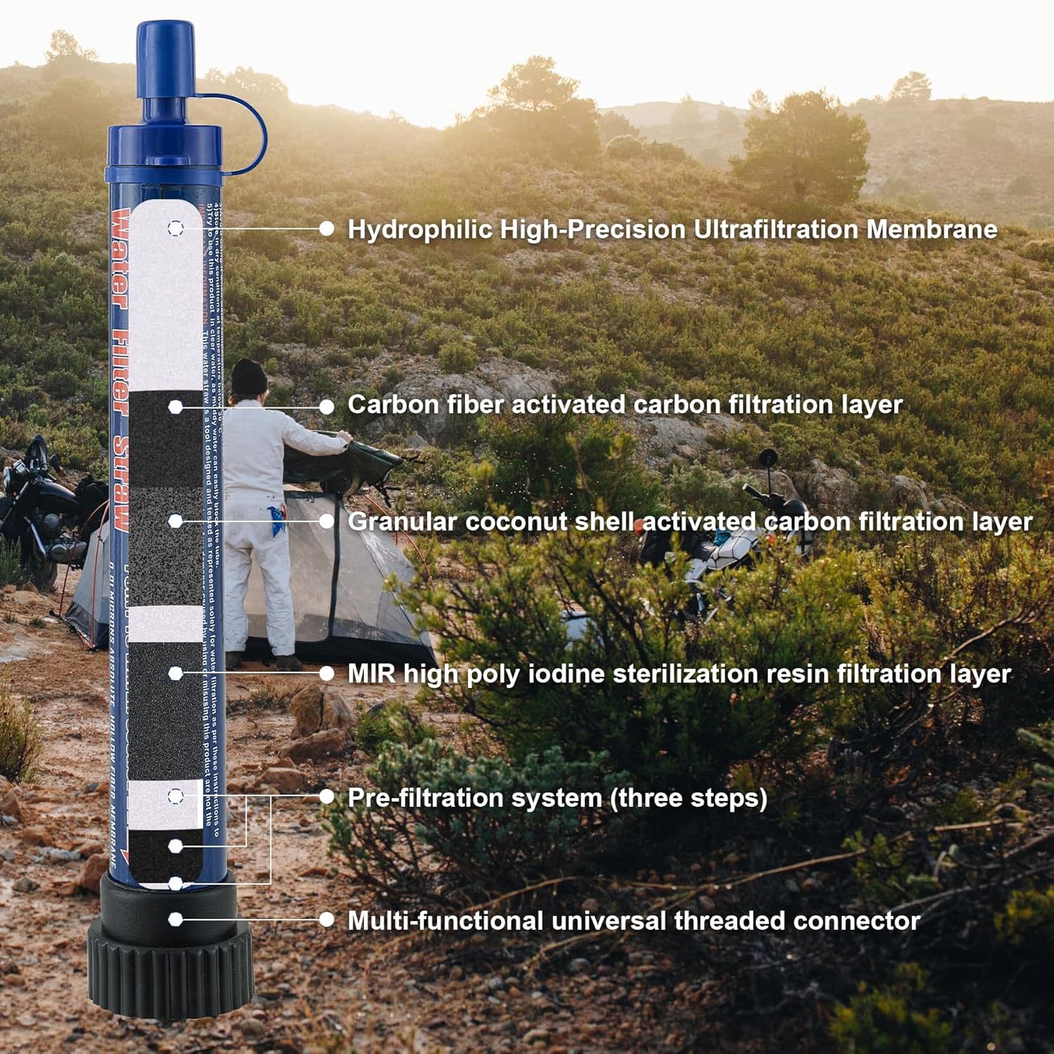 Includes: water filter straw(7.1 inch x 0.9 inch) x 1 , lanyard x 1, 18cm telescopic extension tube x 1, 60cm silicone extension tube x 1, 700ml blue water bag x 1, EVA bag x 1