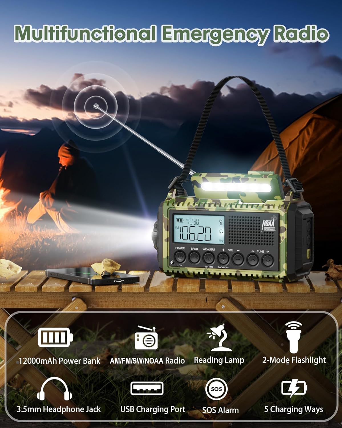 ใ๐๐ฑ๐ฑ๐ถ๐๐ถ๐ผ๐ป๐ฎ๐น ๐๐ฒ๐ฎ๐๐๐ฟ๐ฒ๐ใ- 5 power ways : battery, hand crank,solar,USB-C charging, 3 AAA batteries(not included). Am/fm/shortwave bands and 7 NOAA weather channels, high quality radio sound,16-level volume, USB output port to charge mobile devices, 4H-8H-12H-16H-20H-24H Timer for weather alert, lock-out function, 3.5mm earphone jack to enjoy your leisure time privately.