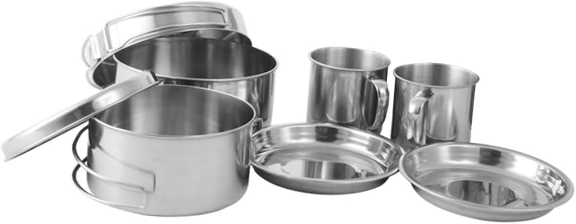 -The stainless steel camping cookware kit contains stew pot, frying pan, plates, and cups, multipurpose to use multifunctional camping cookware.