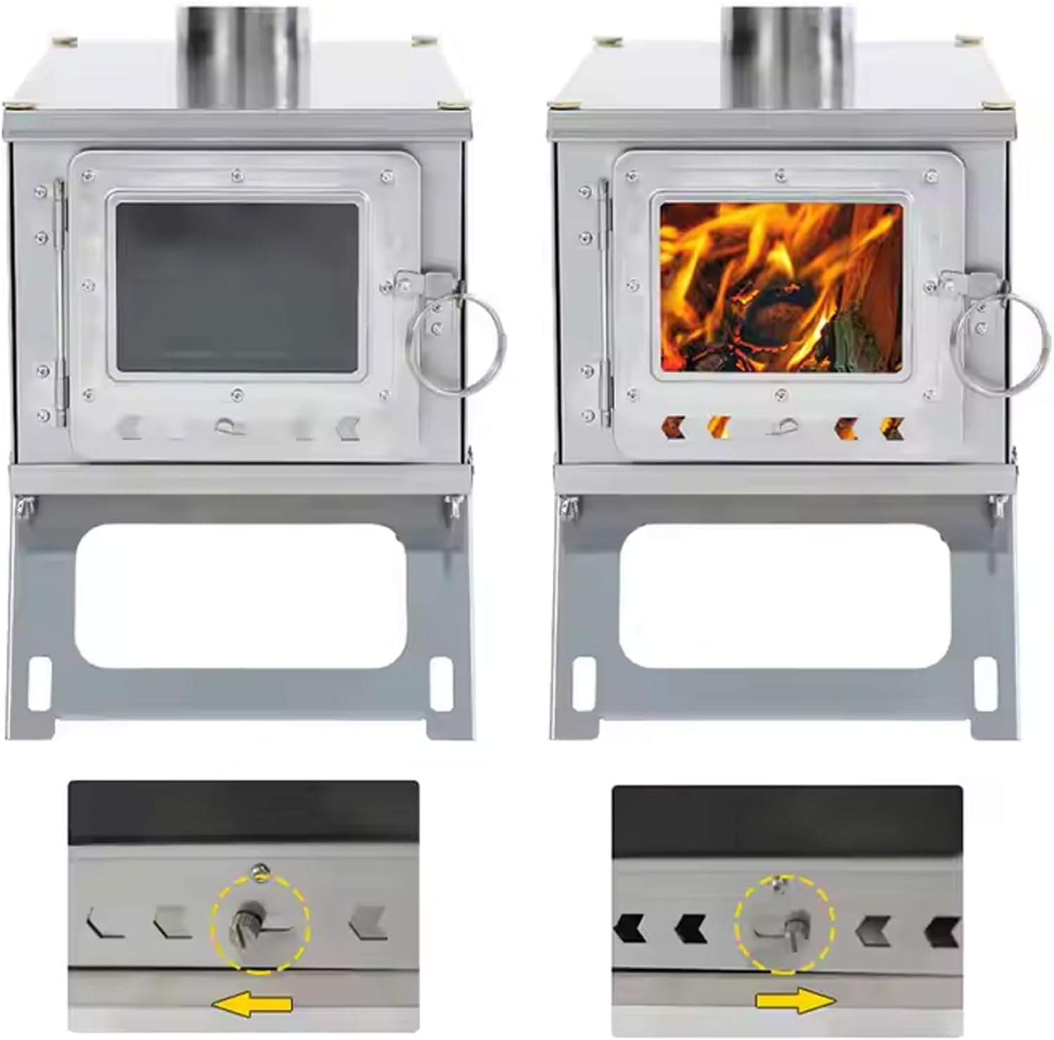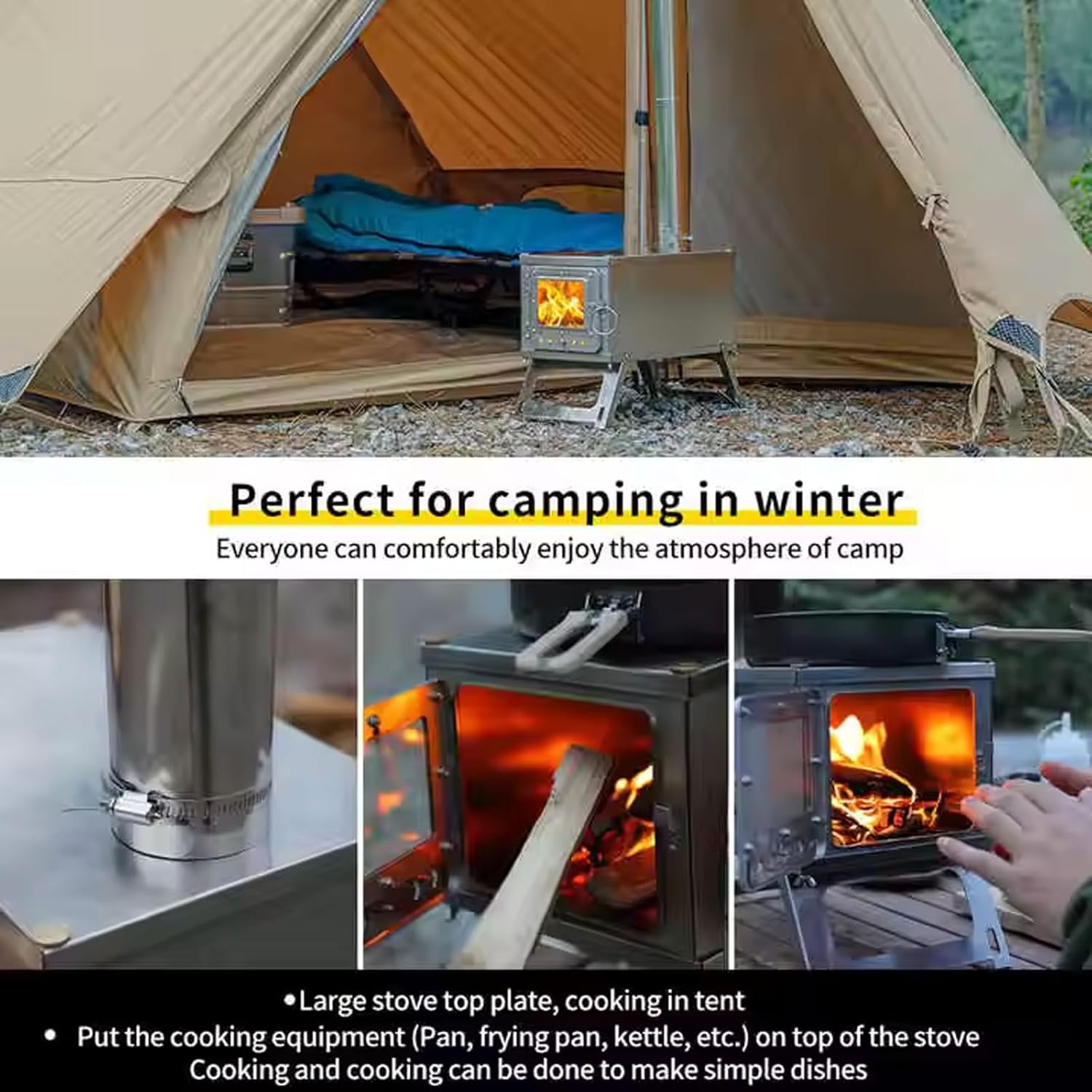 FULL COMBUSTION AND HEAT OUTPUT:Portable wood stoves have air intakes on both sides and on the back, increasing air intake for secondary combustion, effectively reducing your wood consumption and maximizing heat output. You can heat up the tent in a short time, reducing the time when cooking delicious food
