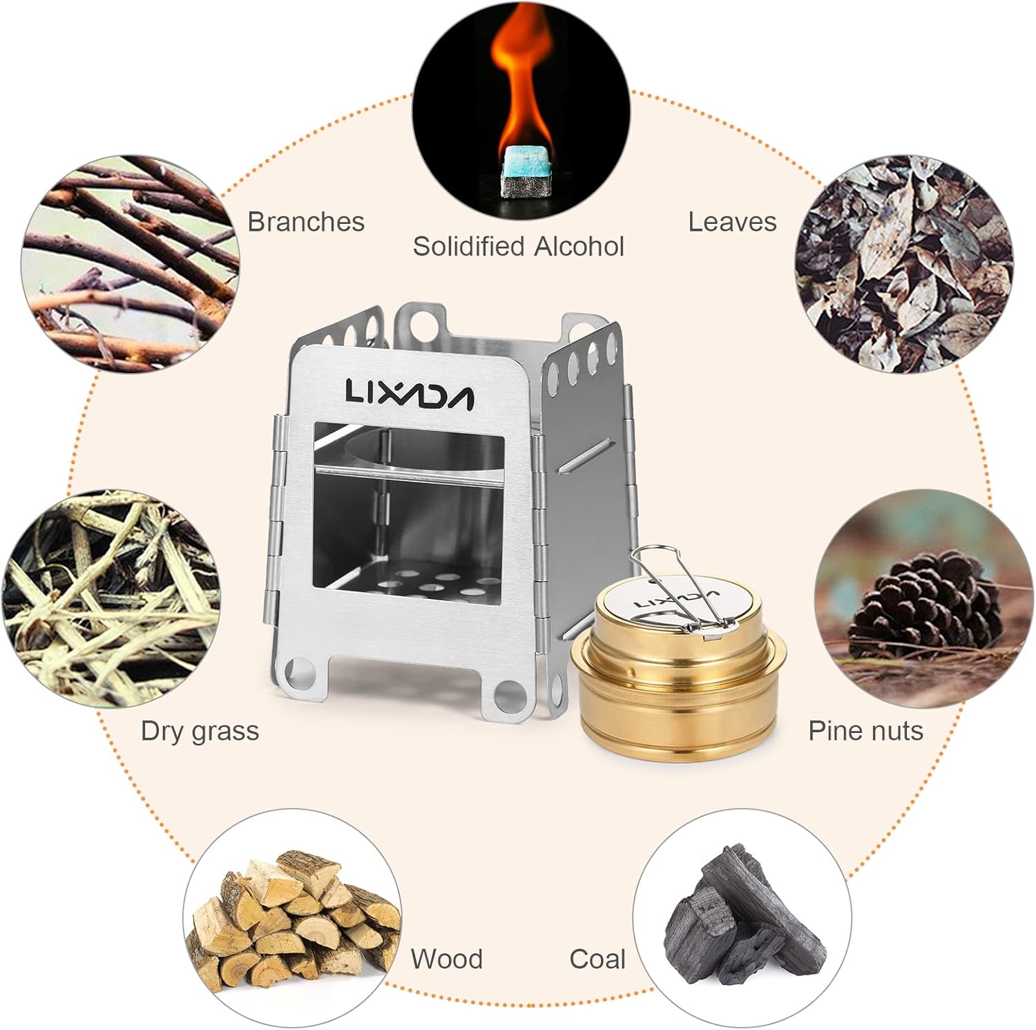 Backup alcohol burner: Fits inside the wood stove, providing an alternative fuel source. Works with solid or liquid alcohol.