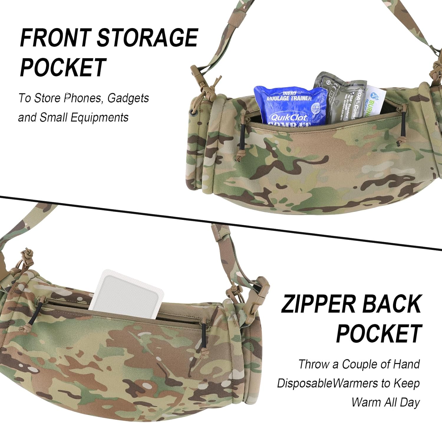 Attach to Vest:To fit snugly under your flap or placard system on your vest, attaching easily via hook and loop . This unique design allows you to conveniently run a hanger pouch or Tourniquet in front or behind the hand warmer.