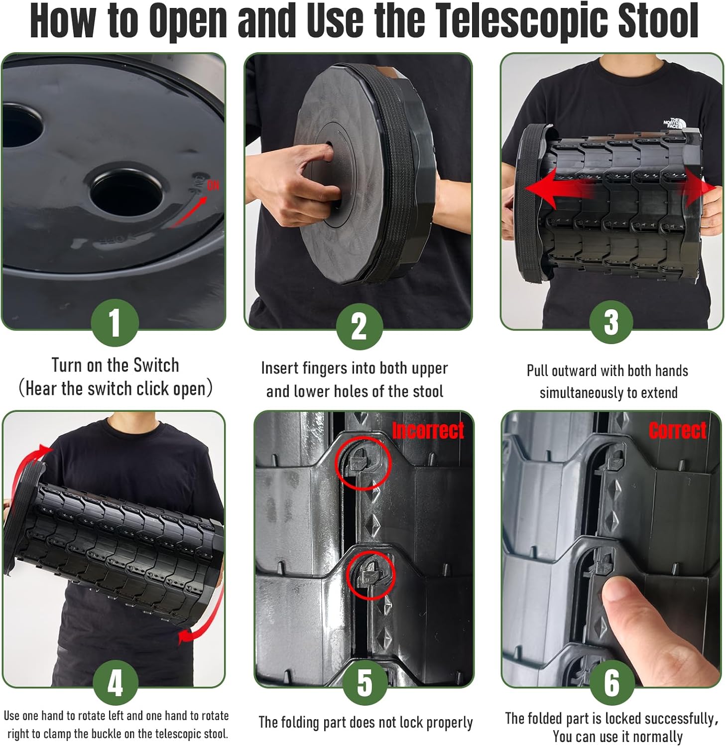 【Easy to Open and Use】The interior of this portable collapsible stool is designed with stiffeners to hold it in place, making the stool stronger and easier to open and close. The top and bottom of the collapsible stool are designed with two holes, you just need to hold the two holes, stretch and turn them clockwise/counterclockwise, and you can easily open and close them.