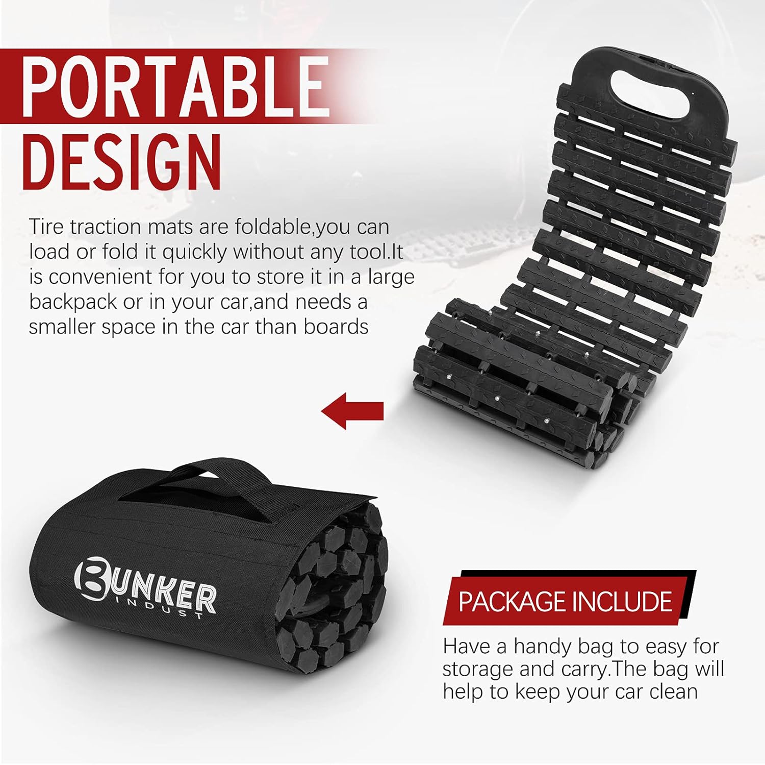 Portable Feature: Have a handy bag to easy for storage and carry.The bag will help to keep your car clean.And this traction mats need a smaller space in the car than boards.You also can store it in a large backpack
