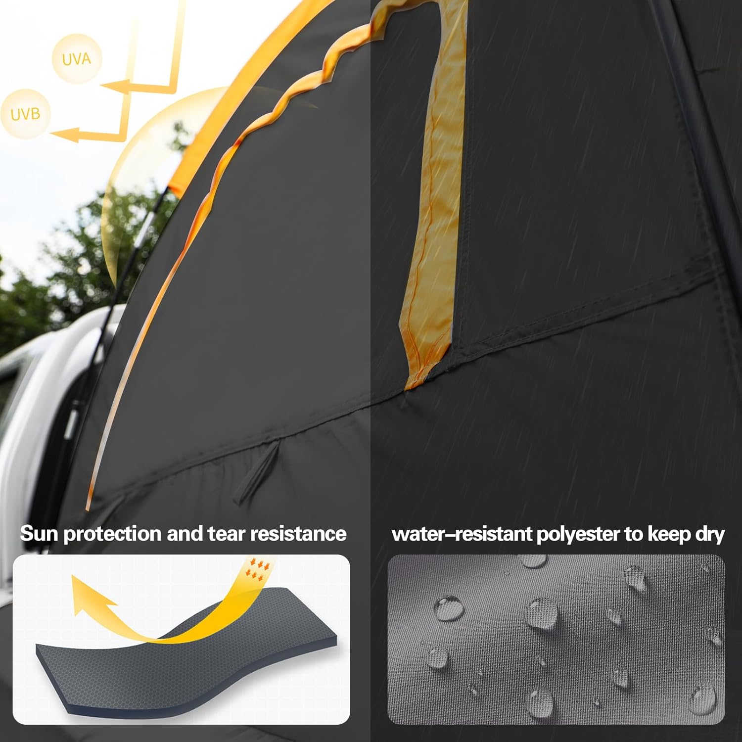 NO Rainfly :PU2000 waterproof coating, The Truck tent with waterproof glue to prevent water leakage at the pinholes. Truck tent adopts 210T Oxford polyester material, waterproof layer at the bottom of the tent to avoid rainwater infiltration.