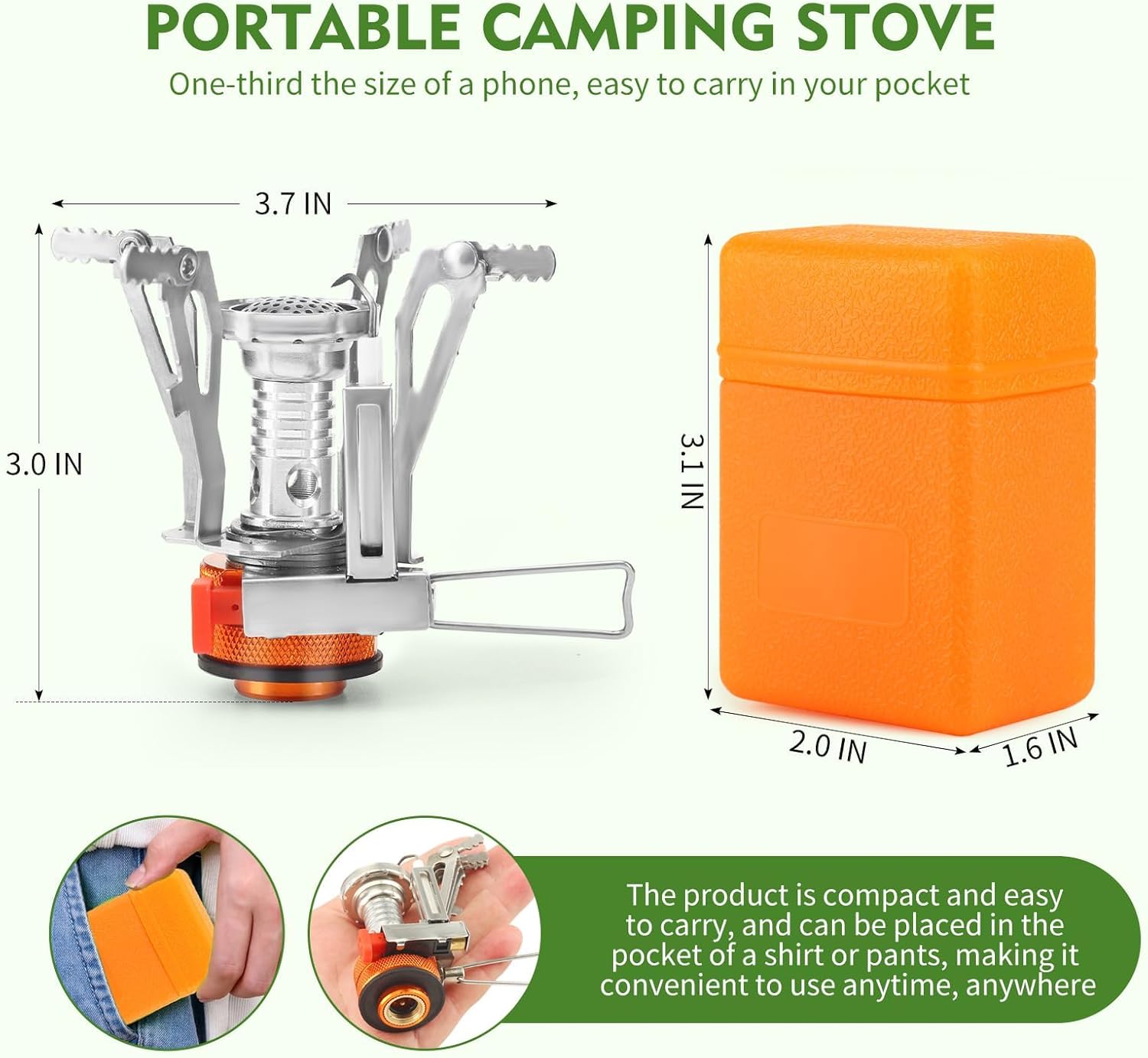 【Specialized Portable Camping Stove】- Portable camping stove is made of high-precision anti rust aluminum alloy, camp stove can be ignited by piezoelectric method; The bracket is stable and efficient for combustion, the backpacking stove is packaged in 3.74 * 2.95 * 2.56IN, weighing 0.24 pounds; Camping stove is portable and lightweight, making portable stove the best choice for outdoor cooking when camping or exploring; It can also be stored as emergency supplies