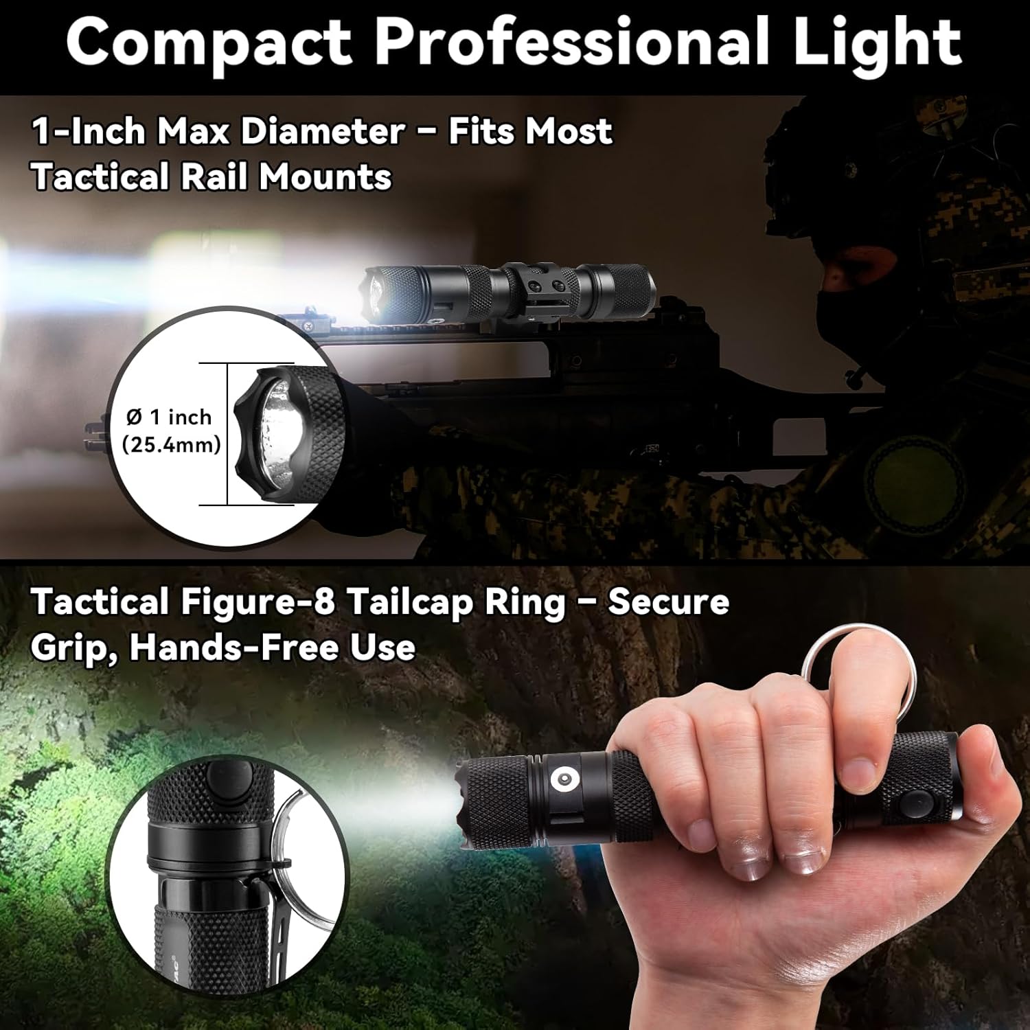 Maximum Output Delivers up to 2550 lumens of intense white light for tactical and everyday use. Beam Distance Projects light up to 197 meters (9,703 candela), illuminating long-range targets. Brightness Modes Offers 5 brightness levels plus a tactical strobe for versatile use. Instant Tactical Strobe One-touch strobe mode (tail switch) for emergency alerts or low-light situations. Momentary-On Press and hold the side switch while off to activate strobe; release to instantly turn off. Tail Switch Power Control Fully press the tail switch to turn the flashlight on or off. Mode Selection via Side Switch Single-click the side button to cycle through Moonlight, Low, Medium, High, Turbo, and Strobe modes. Mode Memory Function Automatically recalls the last brightness setting when powered back on. Figure-8 Tactical Ring Design Designed with a figure-8 style attachment point for secure tactical carry and gear integration. Dual Charging Options Supports both magnetic charging and direct USB input, offering flexible recharging choices. Waterproof & Drop-Resistant IPX8 rated and survives 2-meter drops. Reverse Polarity Protection Prevents damage if the battery is installed incorrectly. Power Status Indicator Displays charging status and low battery warnings for timely recharging. Aerospace-Grade Aluminum Matte hard-anodized finish reduces glare and resists smudges. Heat Management Superior heat sink dissipates heat quickly to protect LED lifespan. Mount Compatibility 0.90″ body diameter fits most standard mounts.
