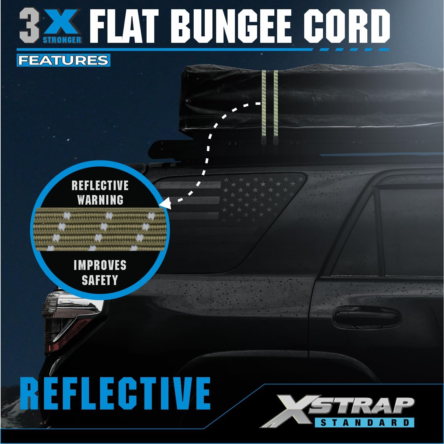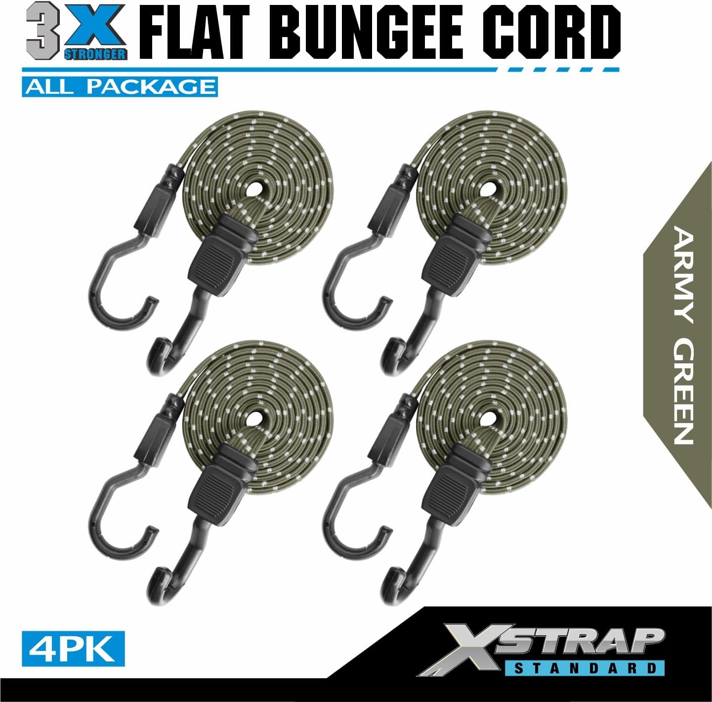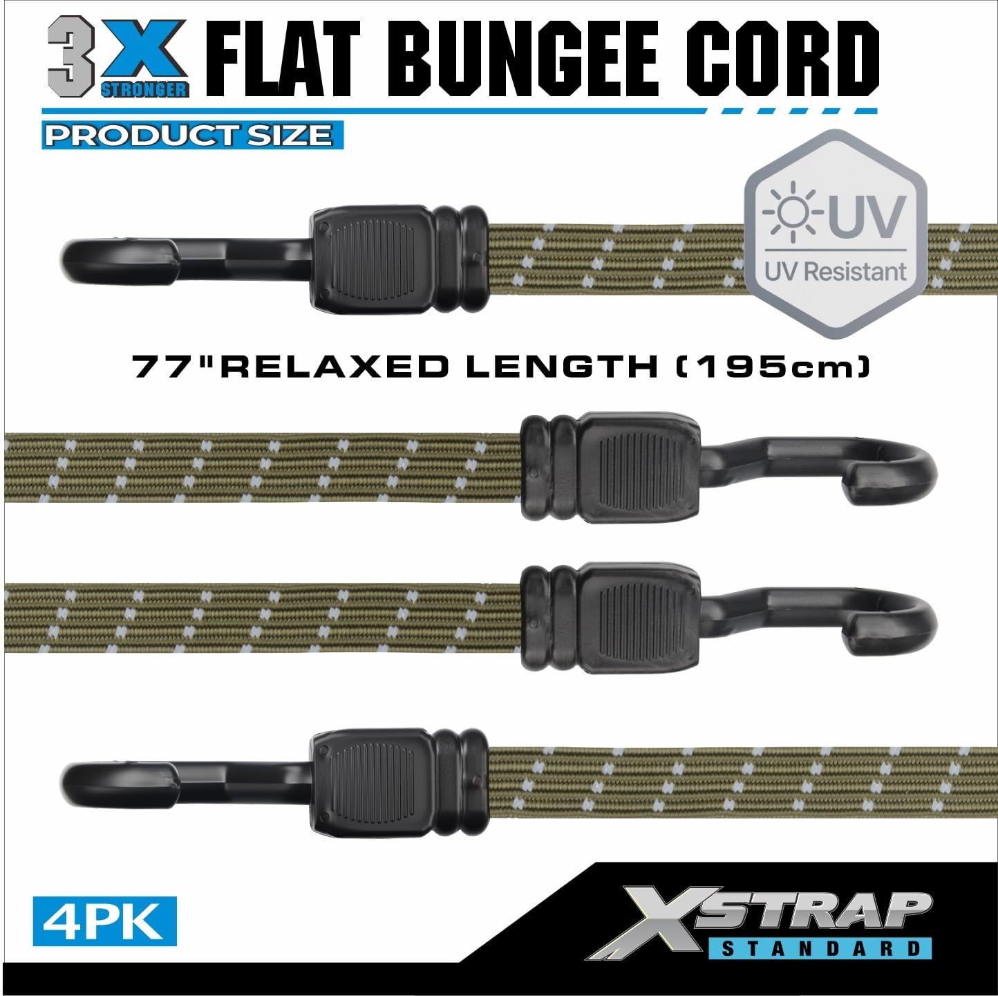 🥾 XSTRAP STANDARD Premium 4PK 77″ Heavy Duty Reflective Flat Bungee Cords with Hooks – Extra Long Elastic Straps for Roof Rack, Camping, Tarp, Bike, Kayak, Trailer, Outdoor Gear Securing, Army Green — Review, Key Features & Current Price